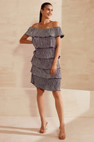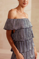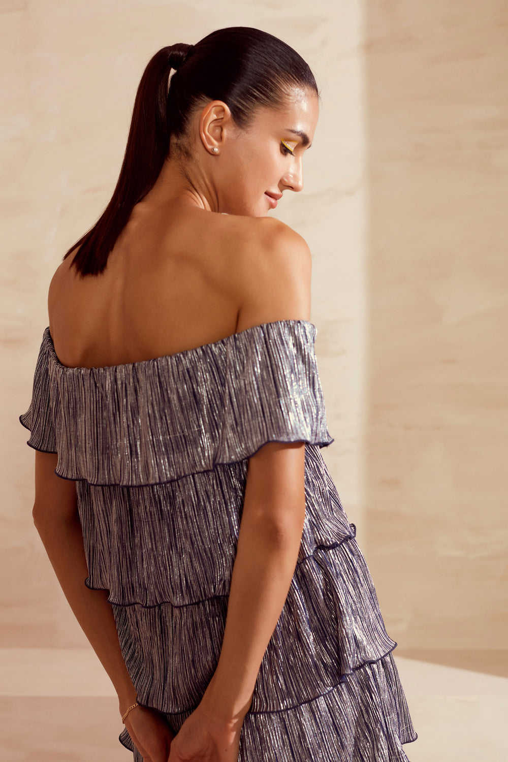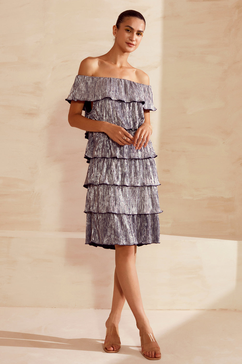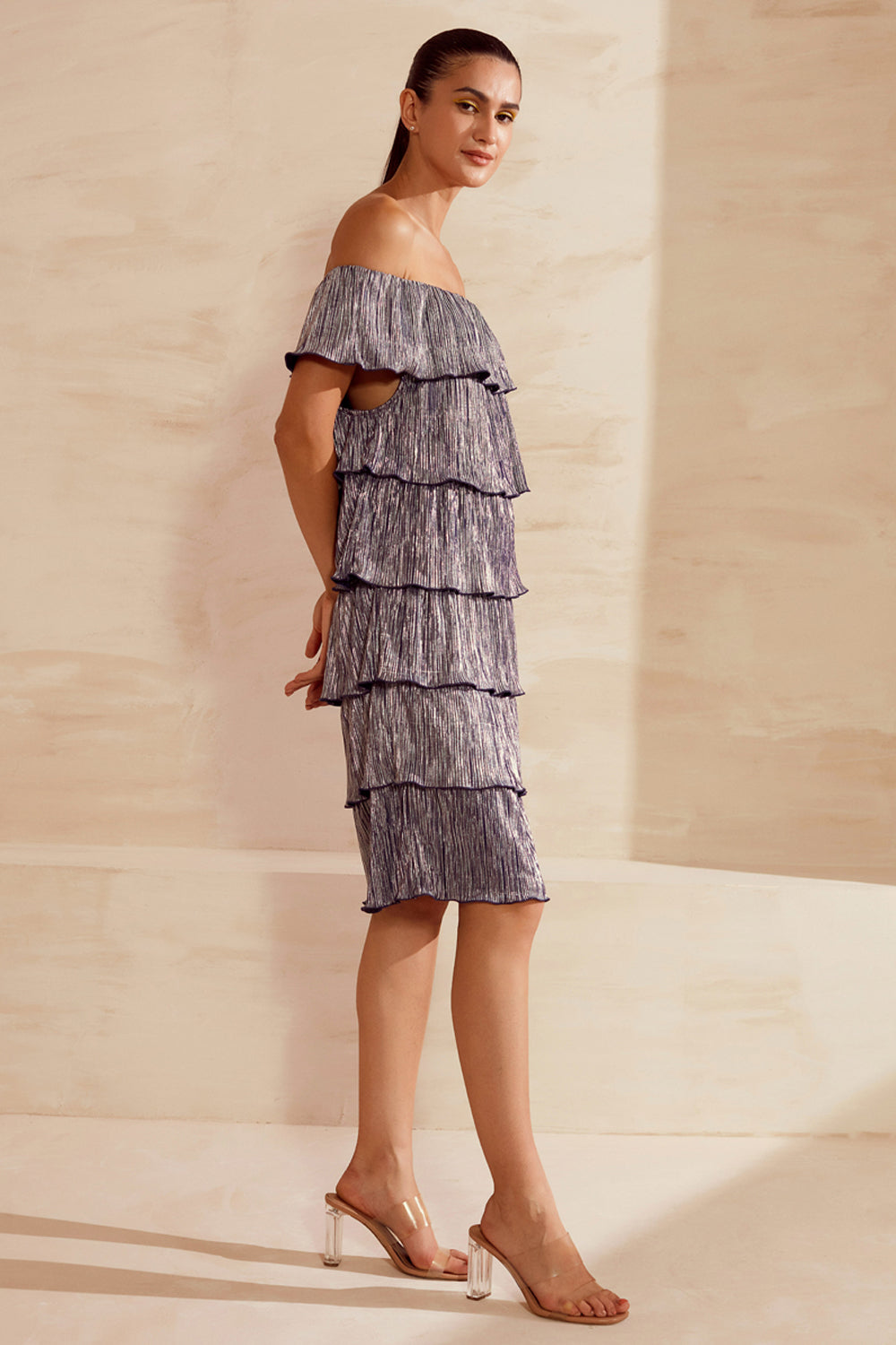 Oh so-so polished pleats, this off the shoulder dress is a feminine essential. This silhouette appeals to the understated feminity of the modern women.