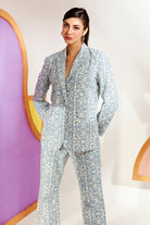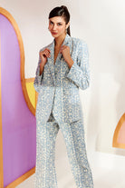 This set is crafted in printed broderie and includes button front blazer and is fully lined with sustainable bamboo cotton. Pants are crafted in printed broderie as well and is half elasticated to give the ensemble a polished look.