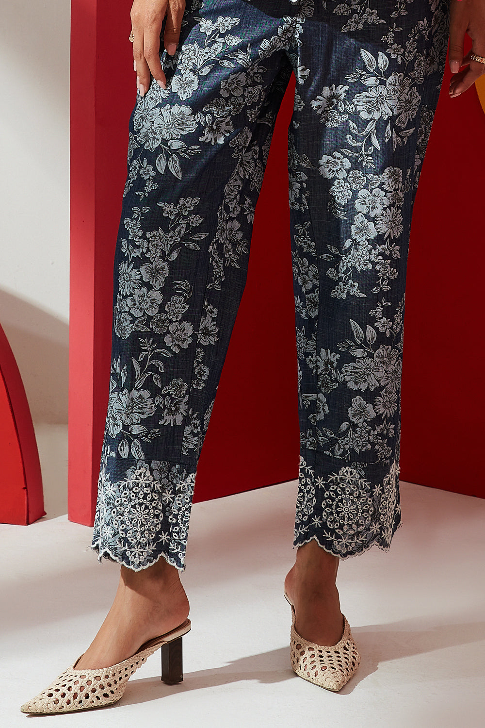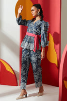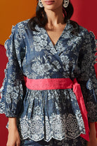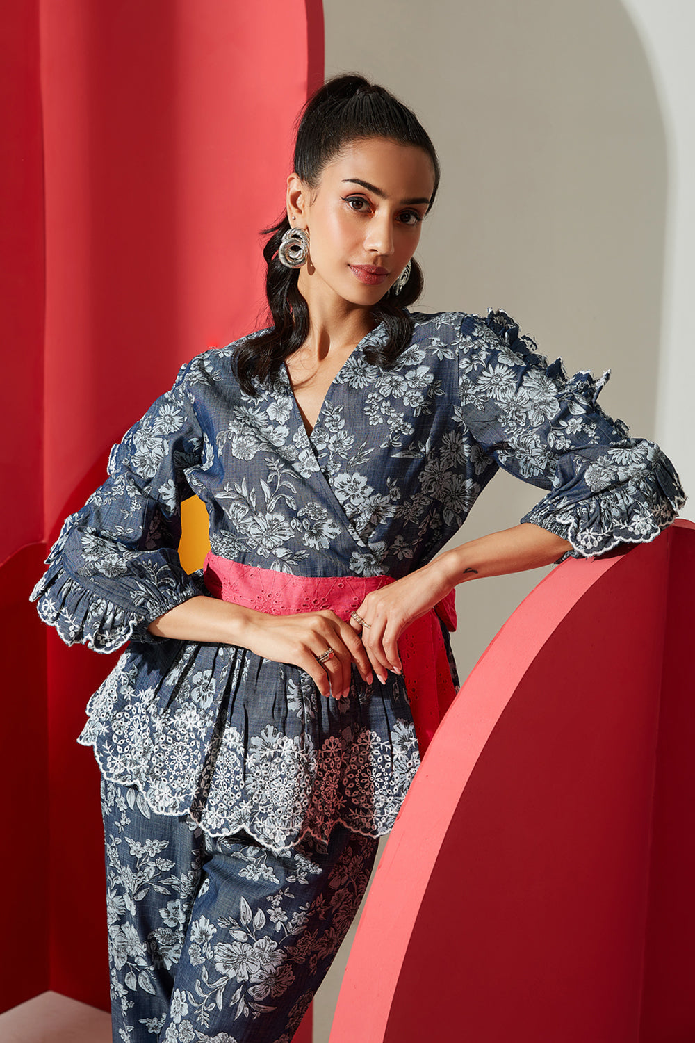 This coord set is made in printed denim with ruffles on the sleeves and broderie in the bottom hem. Contrast pink cosmos wrap tie makes the blouse a striking piece. The pants are also printed and cutwork embroidery at the bottom hem.