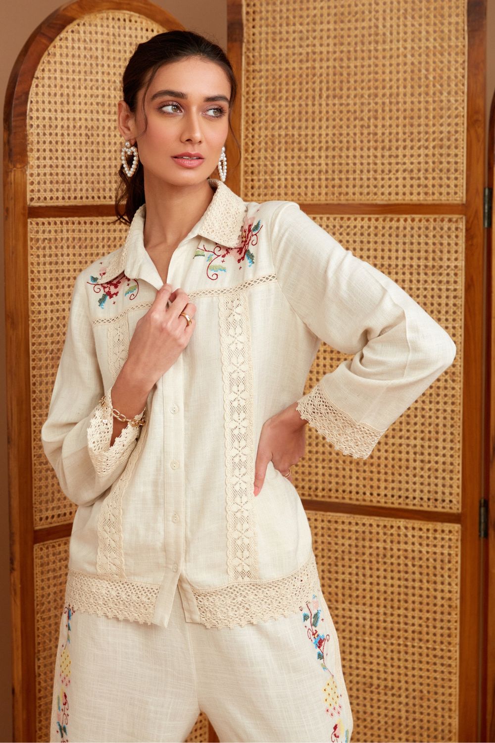 Redefined and flattering. Structured and yet delicate. Beautifully crafted in linen cross stich embroidery and abundance of lace makes this coord set a heads turning statement.