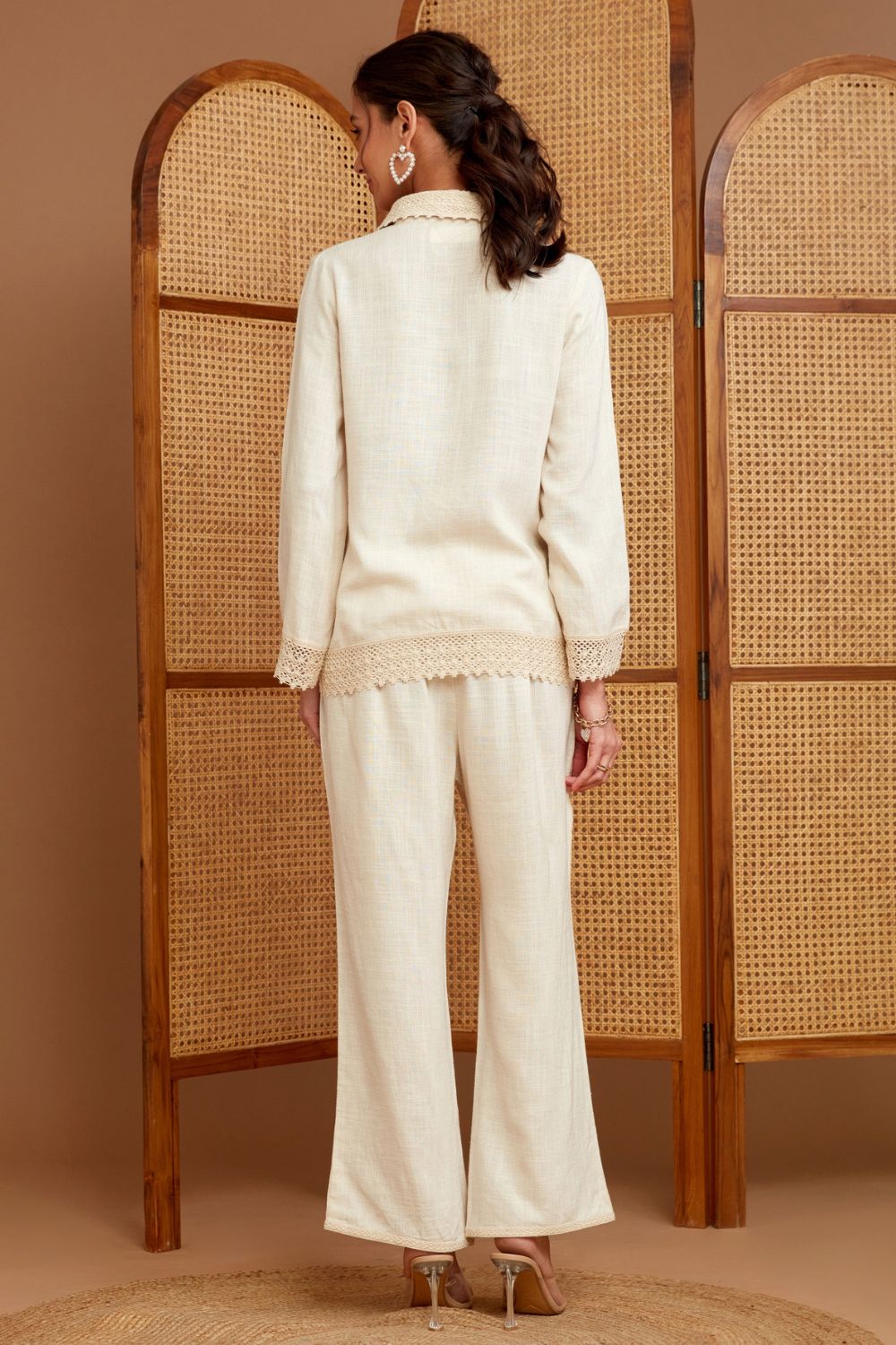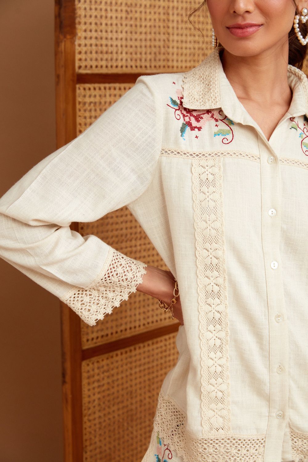 Redefined and flattering.Structured and yet delicate. Beautifully crafted in linen cross stich embroidery and abundance of lace makes this shirt a heads turning statement.