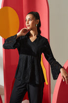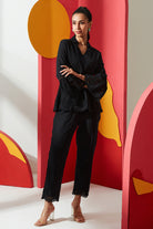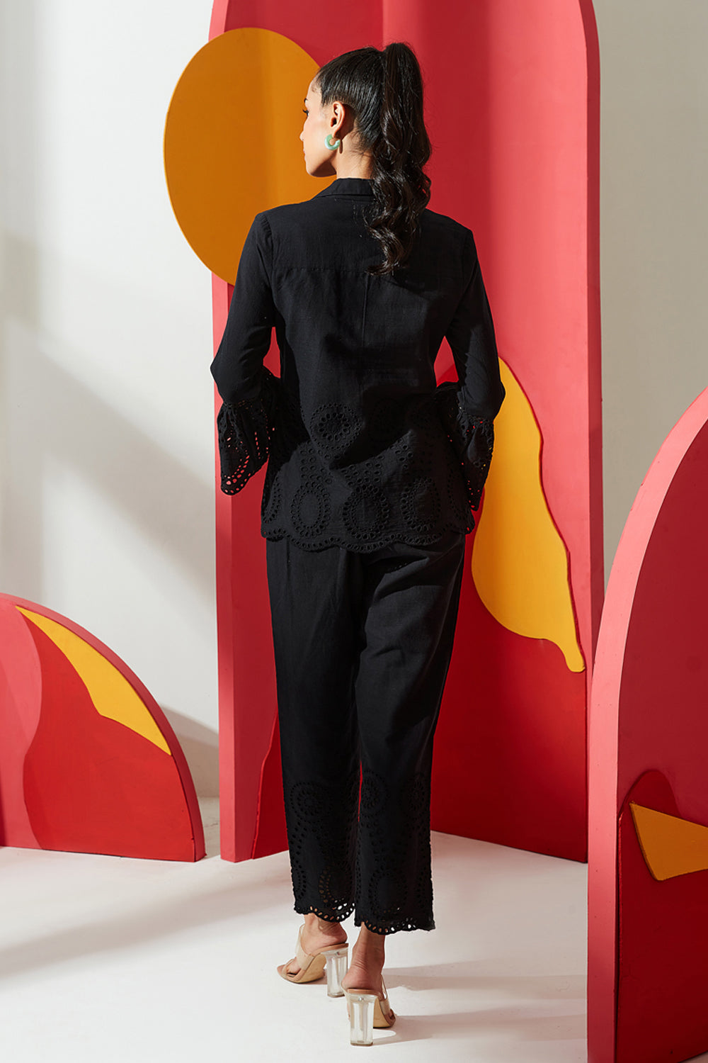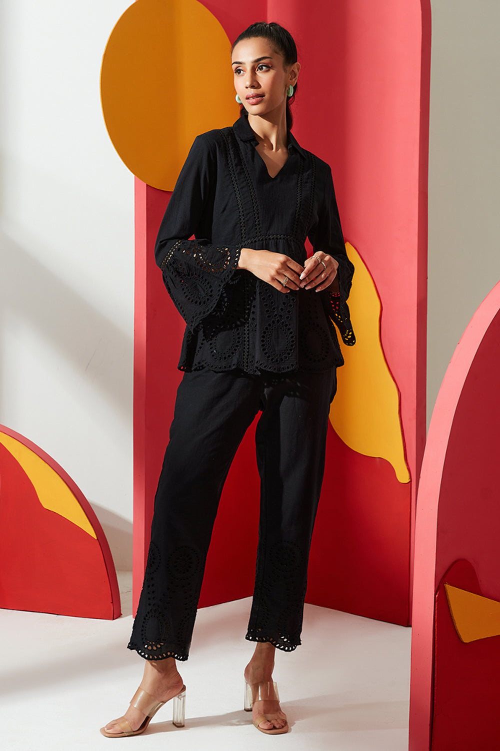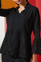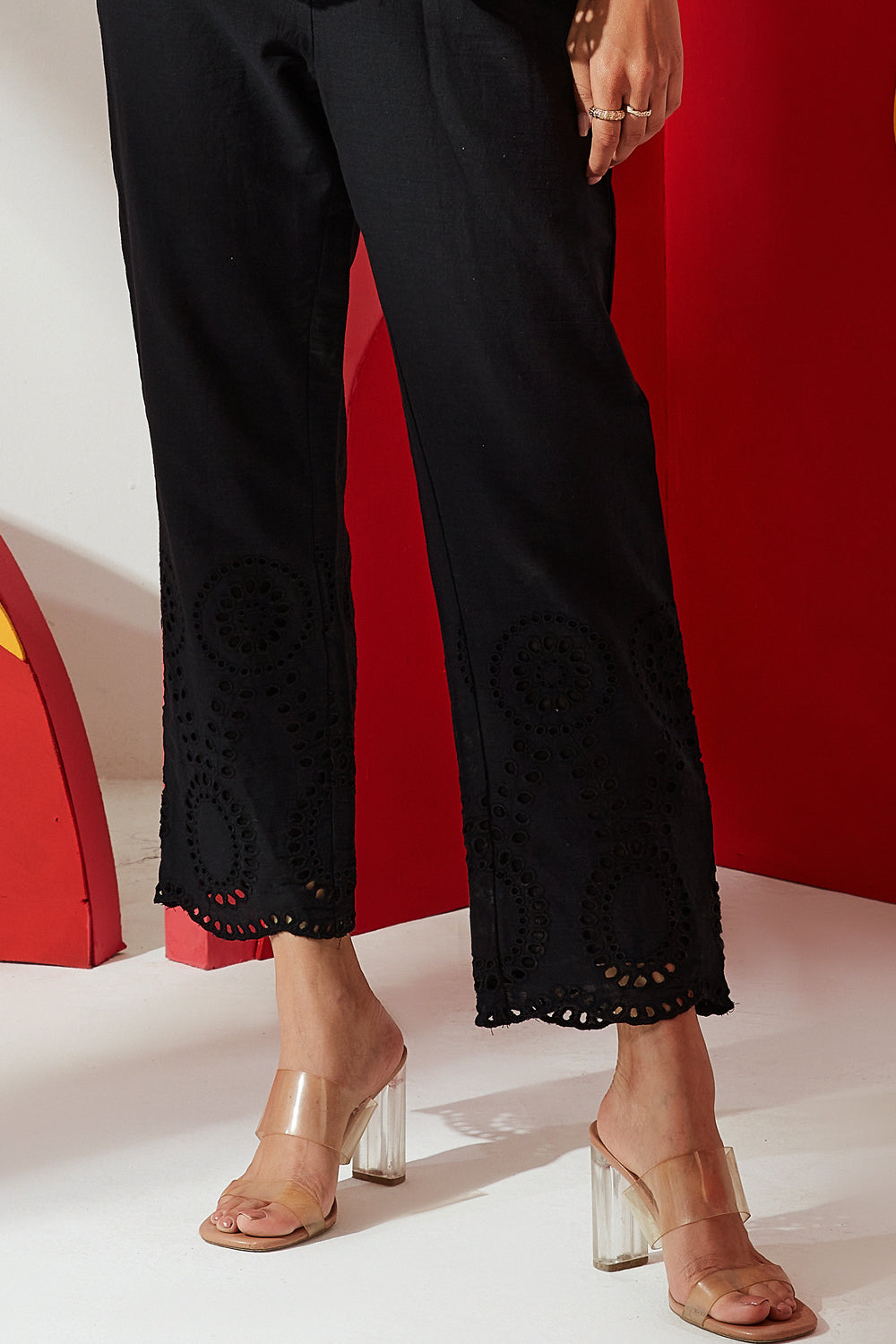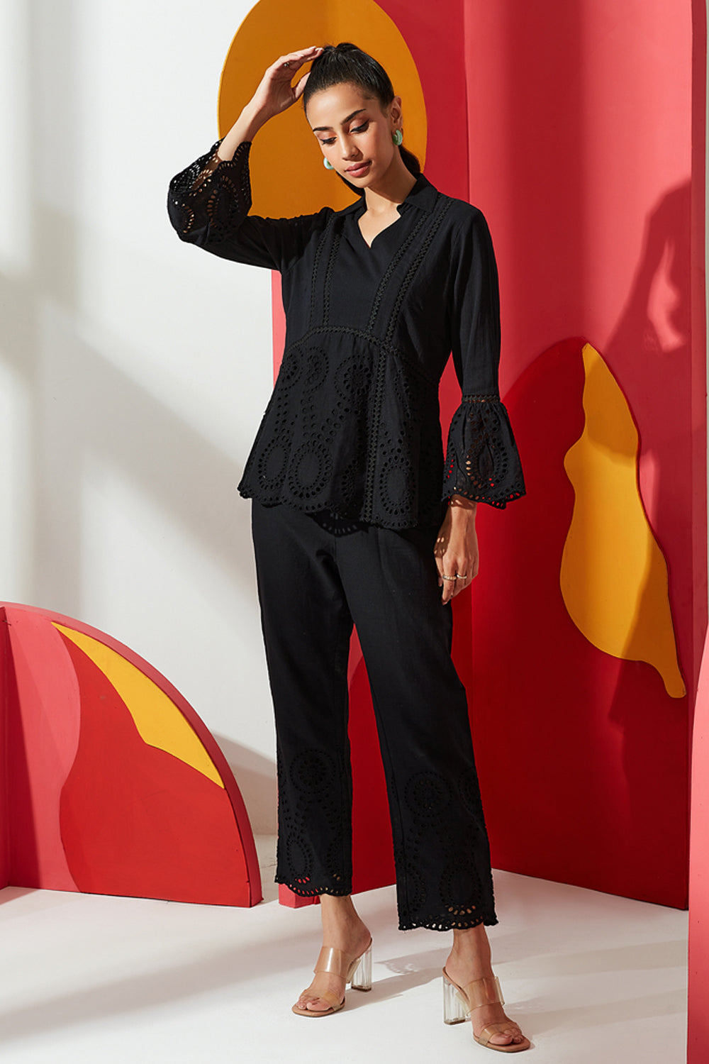 This shirt has detailing of embroidery and cutwork. Crafted in cotton with a classic shirt collar, delicate lace insert detailing and slight bell sleeves makes it a feminine blouse. The pants have a detailing of embroidery and cutwork in the bottom hem.