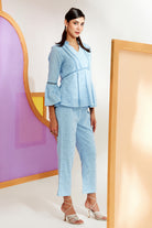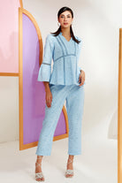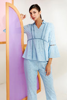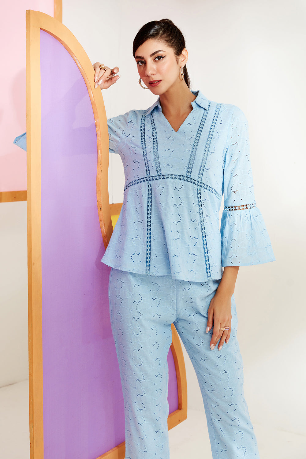 This shirt has been crafted in eyelet lace with a classic shirt collar, delicate lace insert detailing and slight bell sleeves makes it a feminine blouse. The pants have a detailing of embroidery and cutwork in the bottom hem.