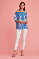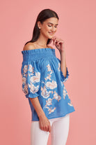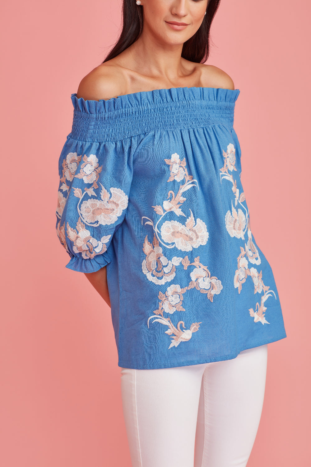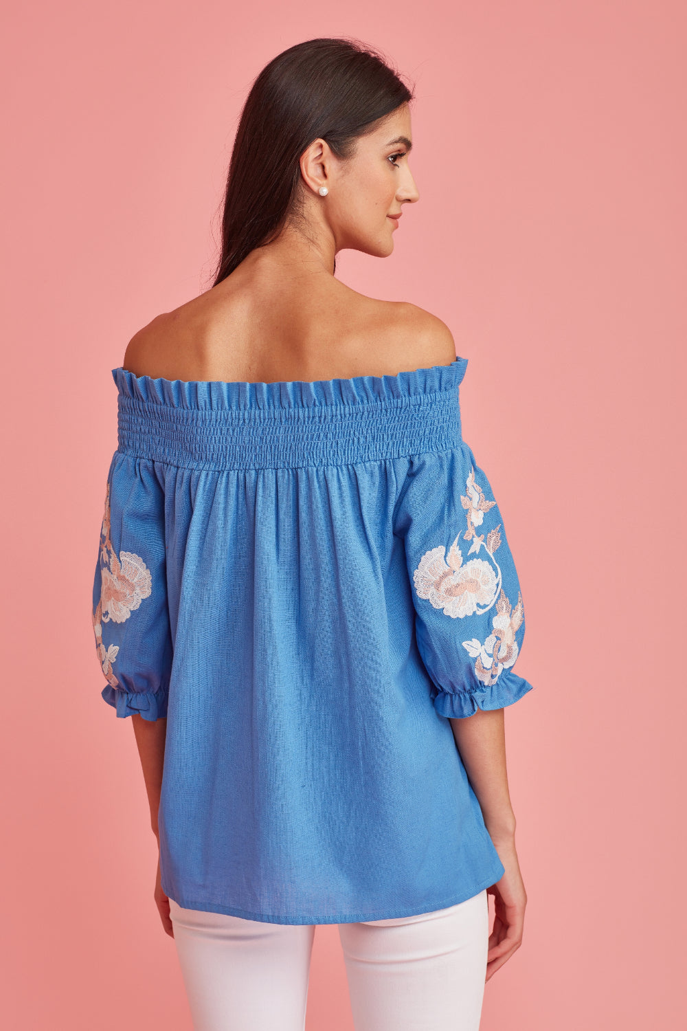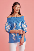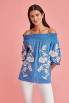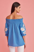 With a dreamy palette, glimmering threadwork. Feminine, Effortless style ,great attention to detail. Fit and fabric is unsurpassed. The exquisite embroidery makes this off the shoulder blouse a must have in your summer wardrobe.