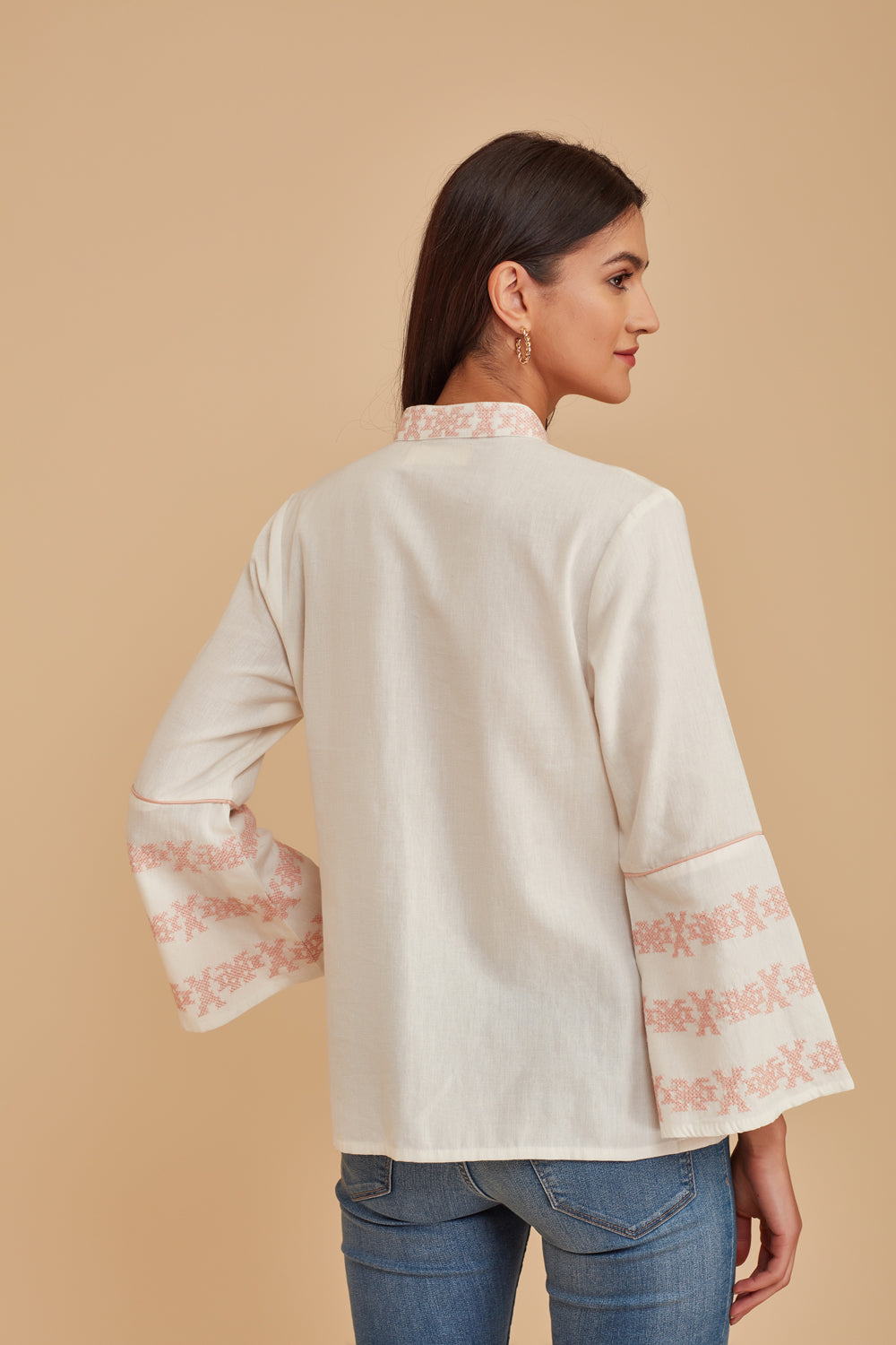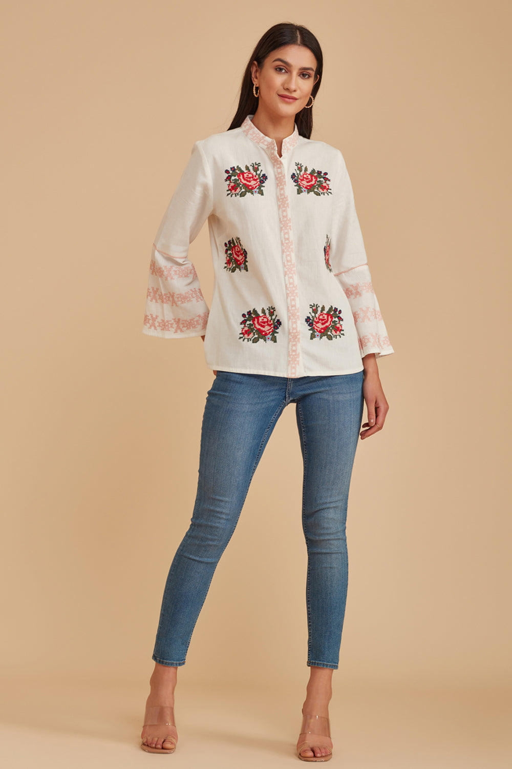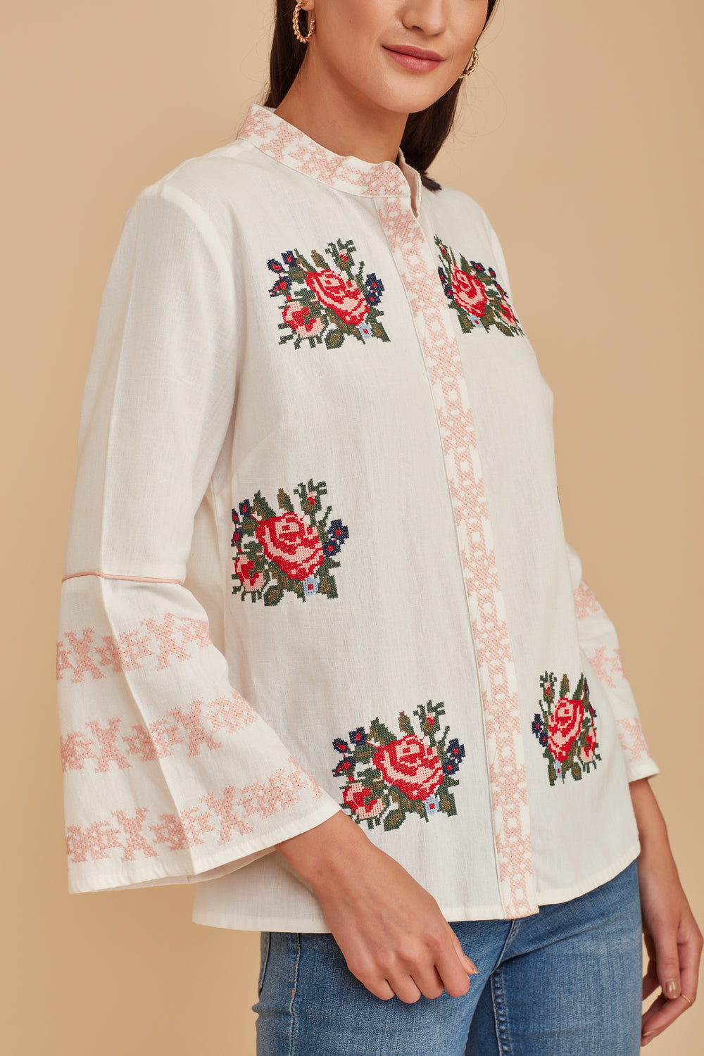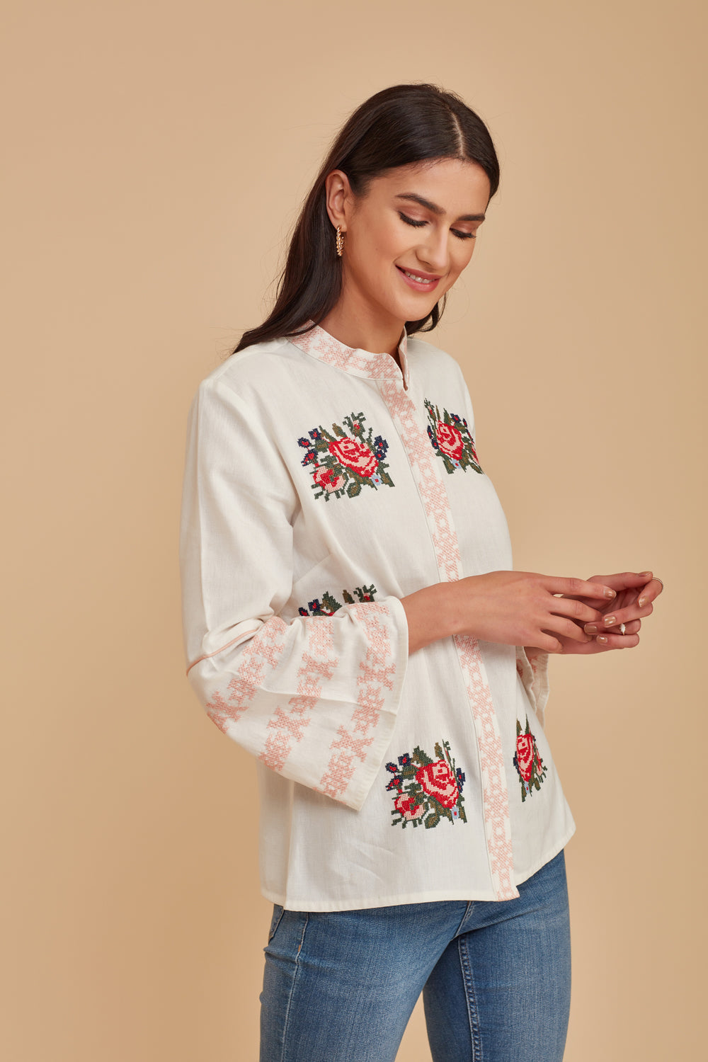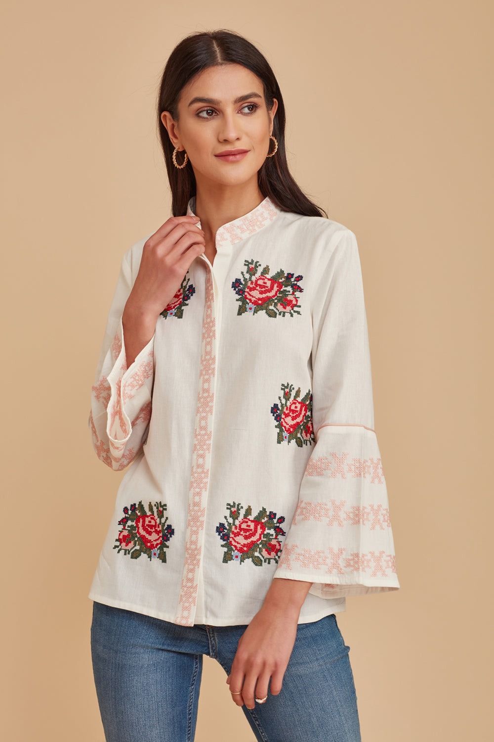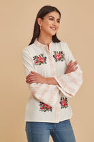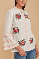 Invite a hint of springtime to your seasonal looks with this sweetly embroidered blouse beautifully finished with a delicate lace trim.