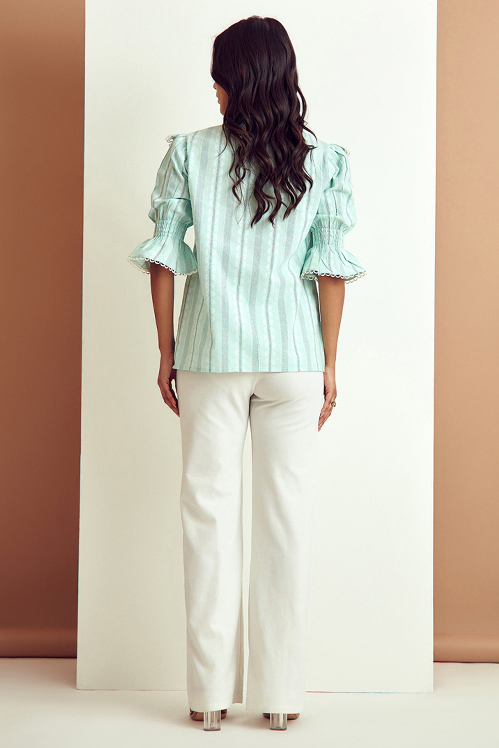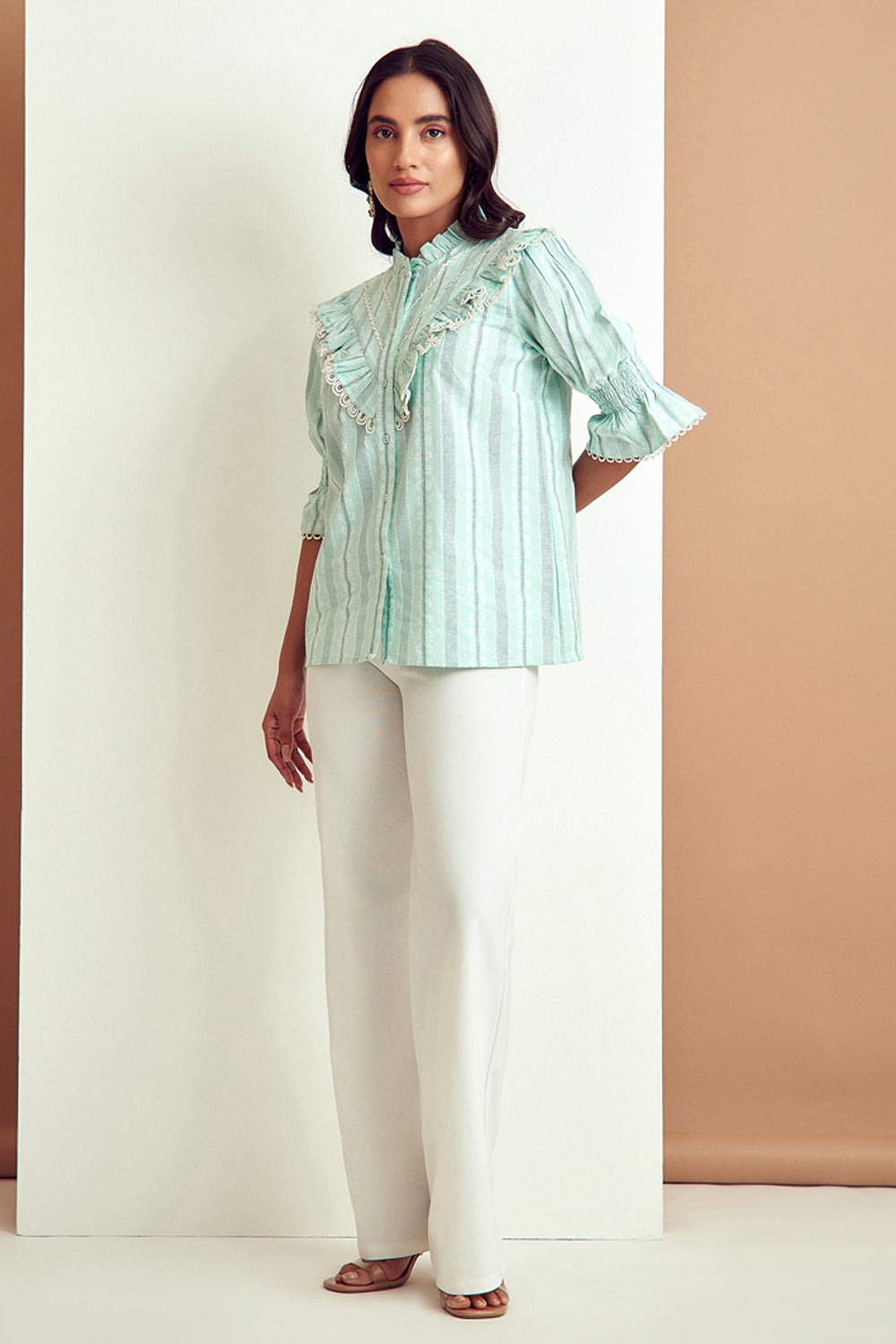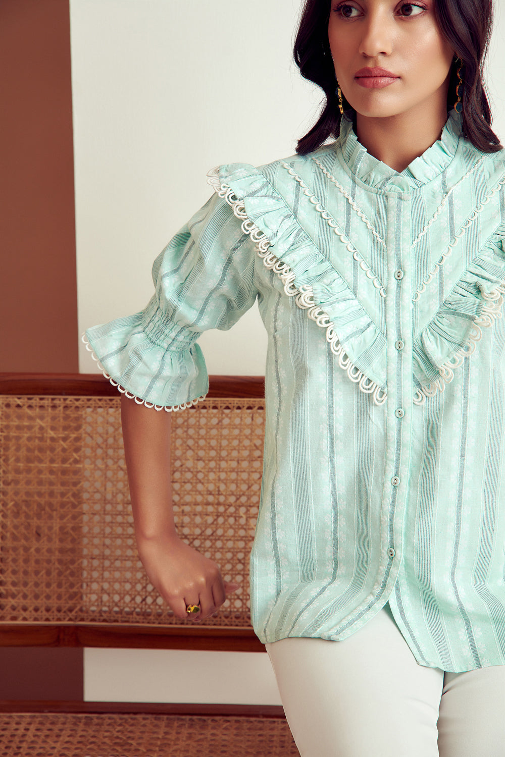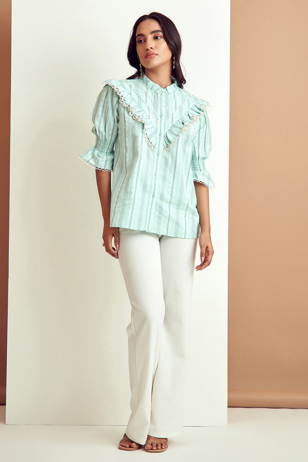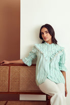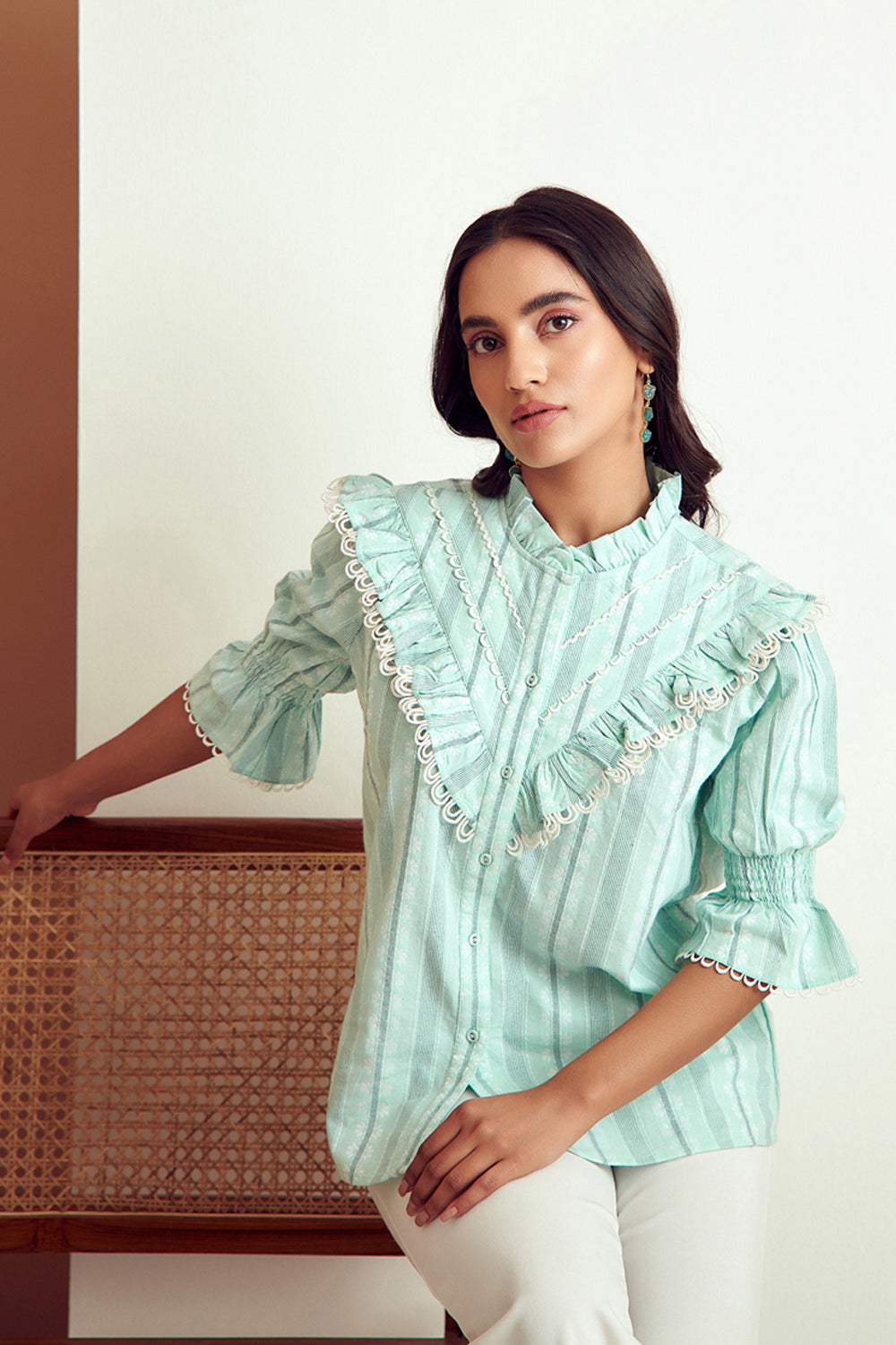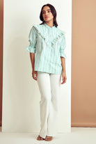 From its structured sleeves to an eyelet lace detailed finish, this stunning blouse has dainty details.Pair it with distressed denims for a look that is both comfortable and endlessly chic.