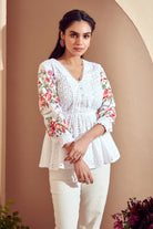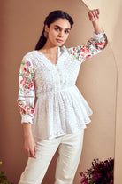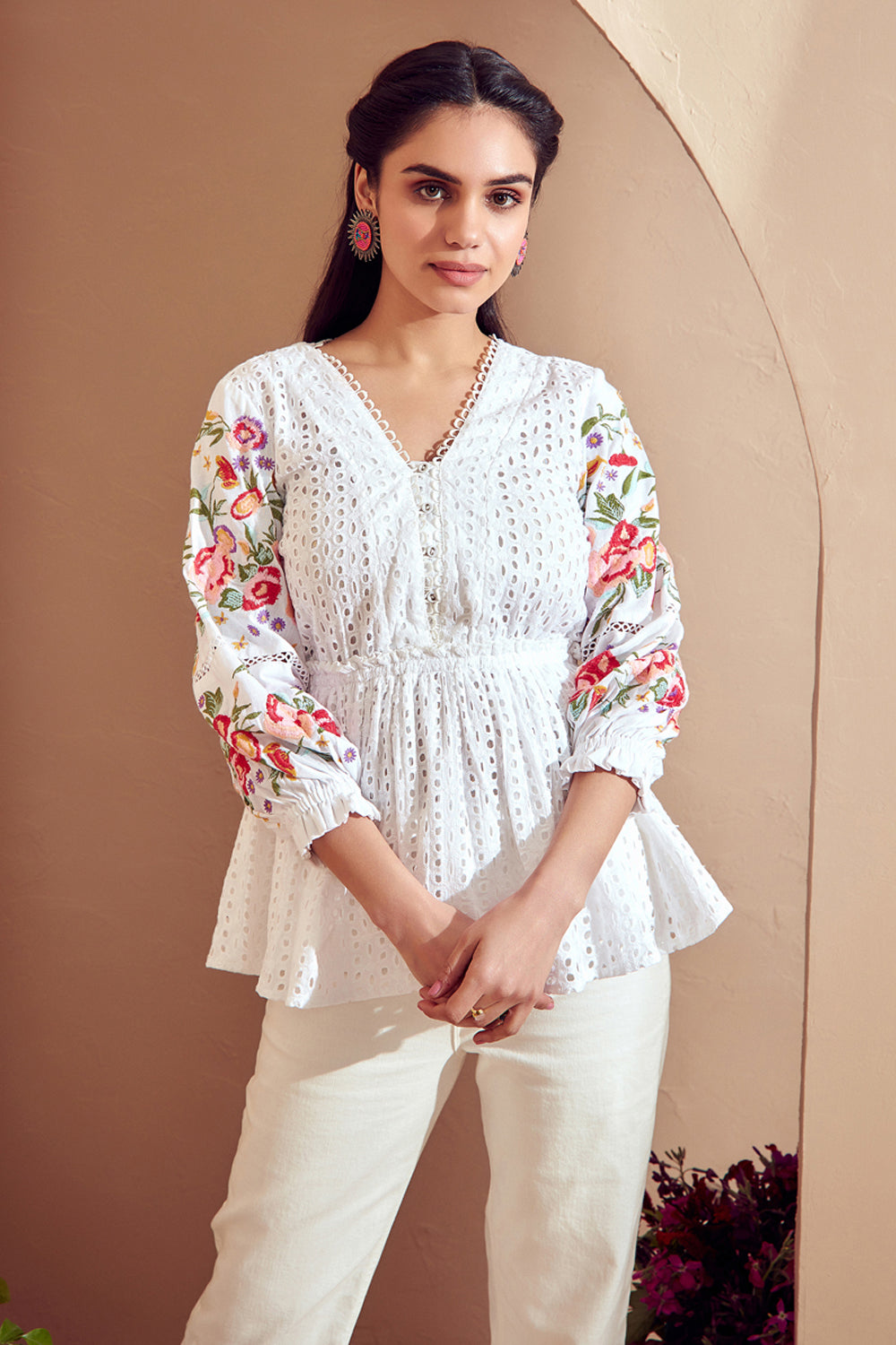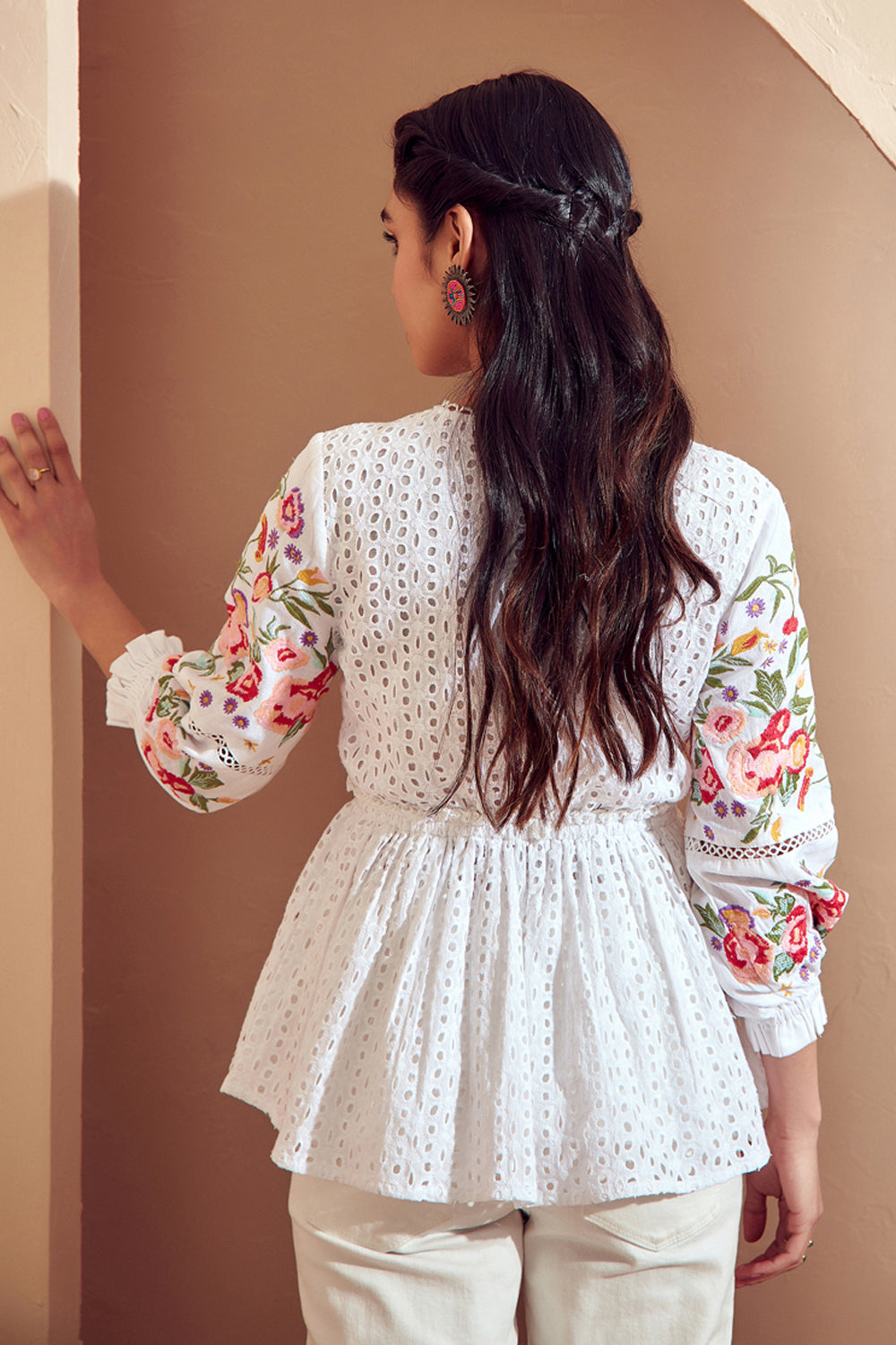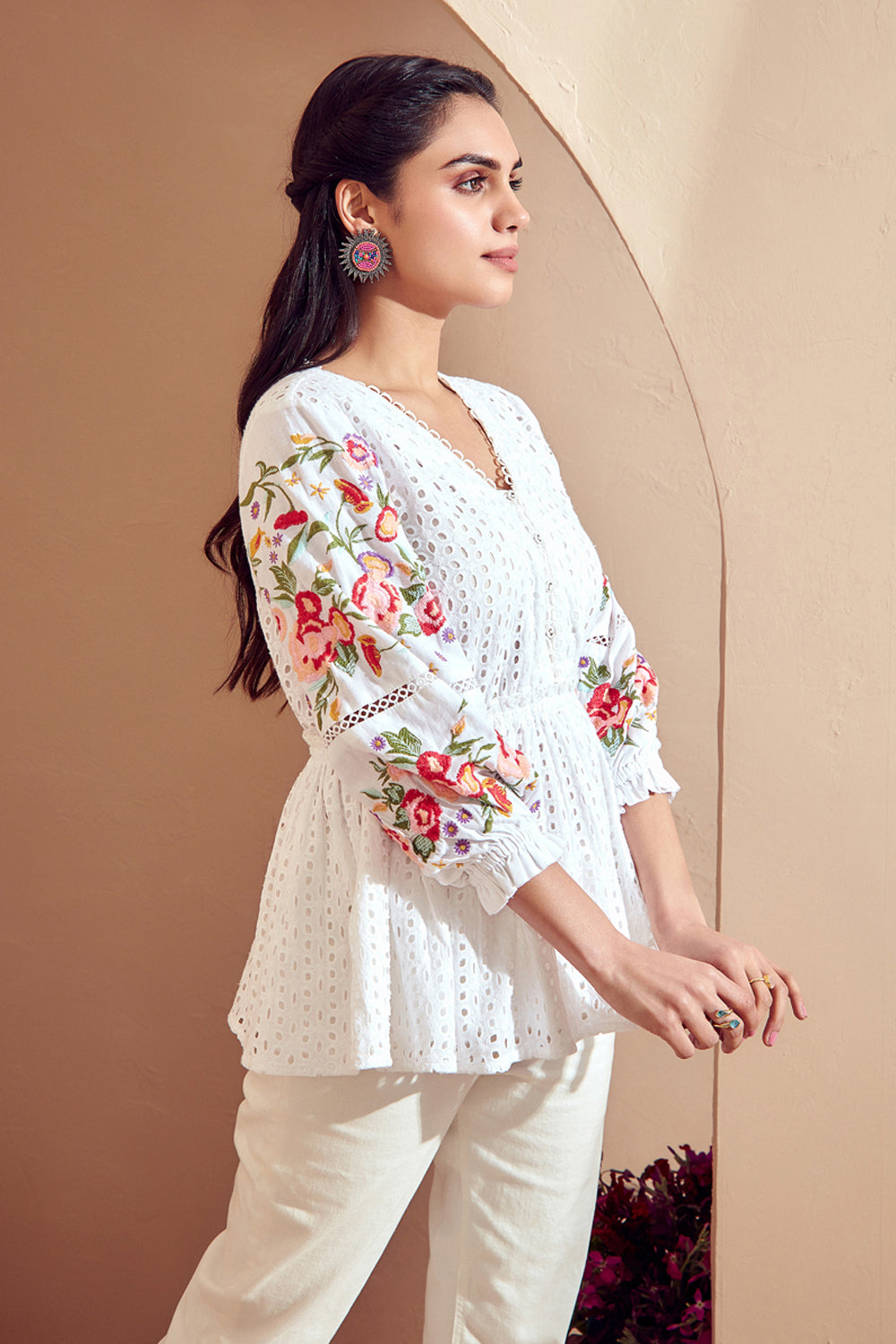 This collection showcases modern woman's inherent feminity and strength. Adorned with bouquets of springtime 's most fabulous embroidery makes this blouse a gorgeous piece for your summer wardrobe.