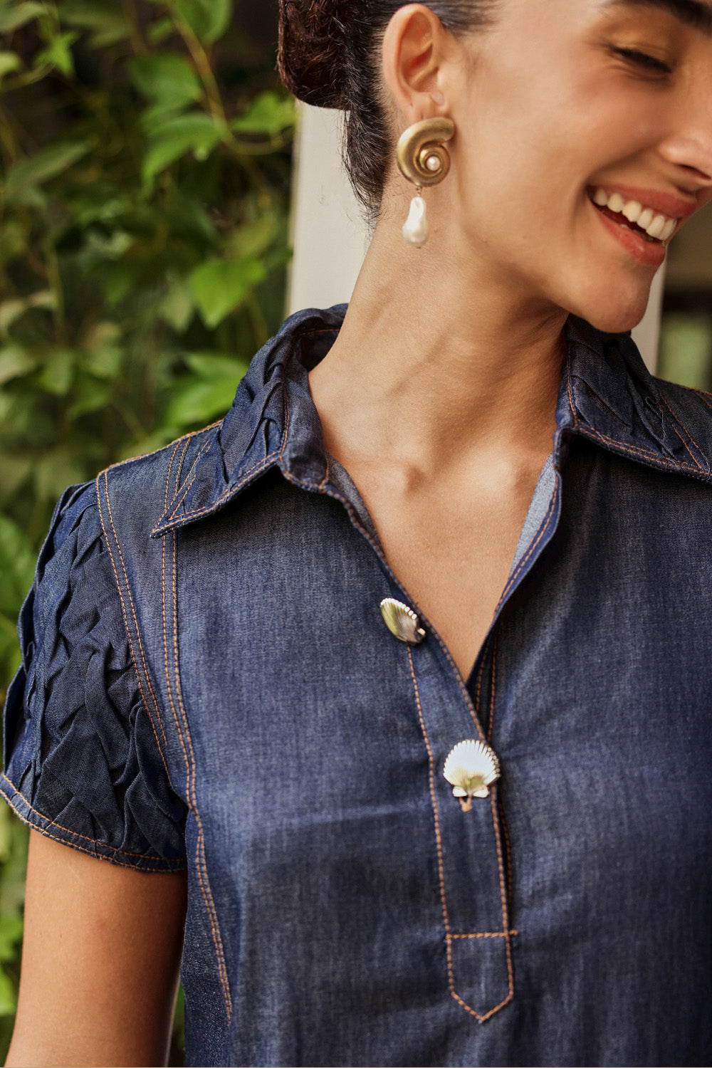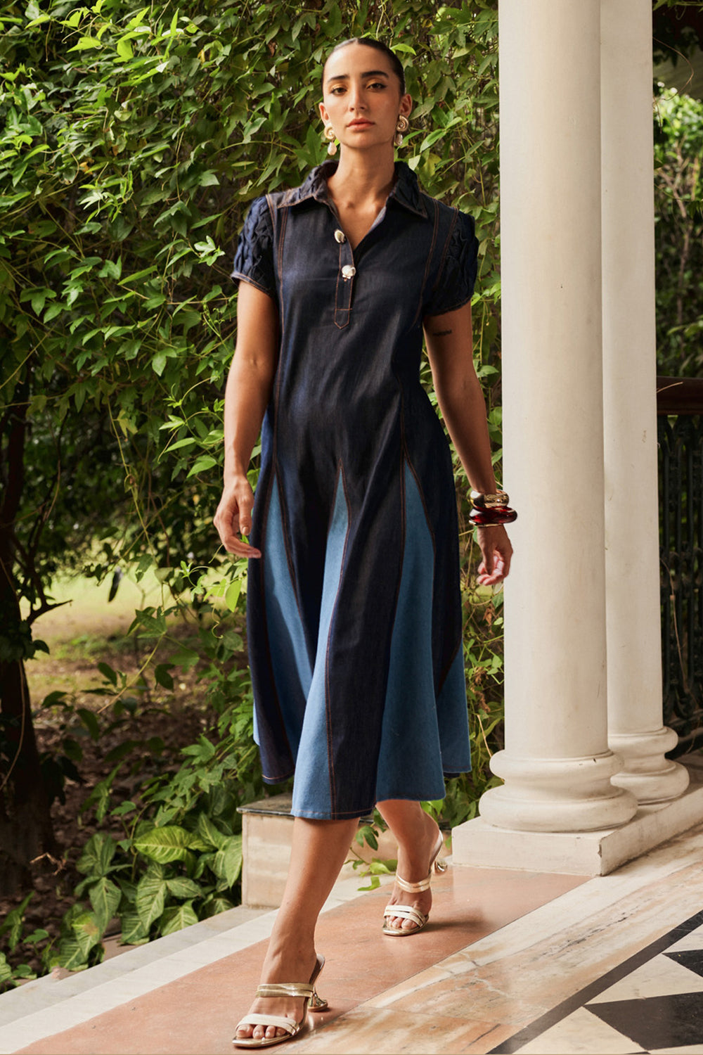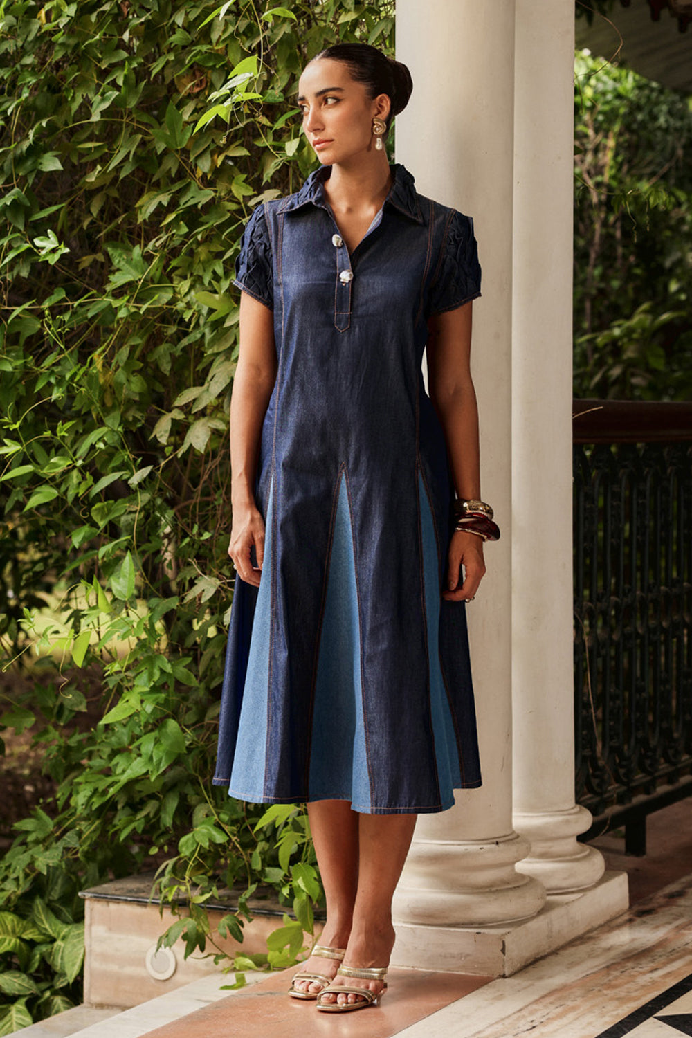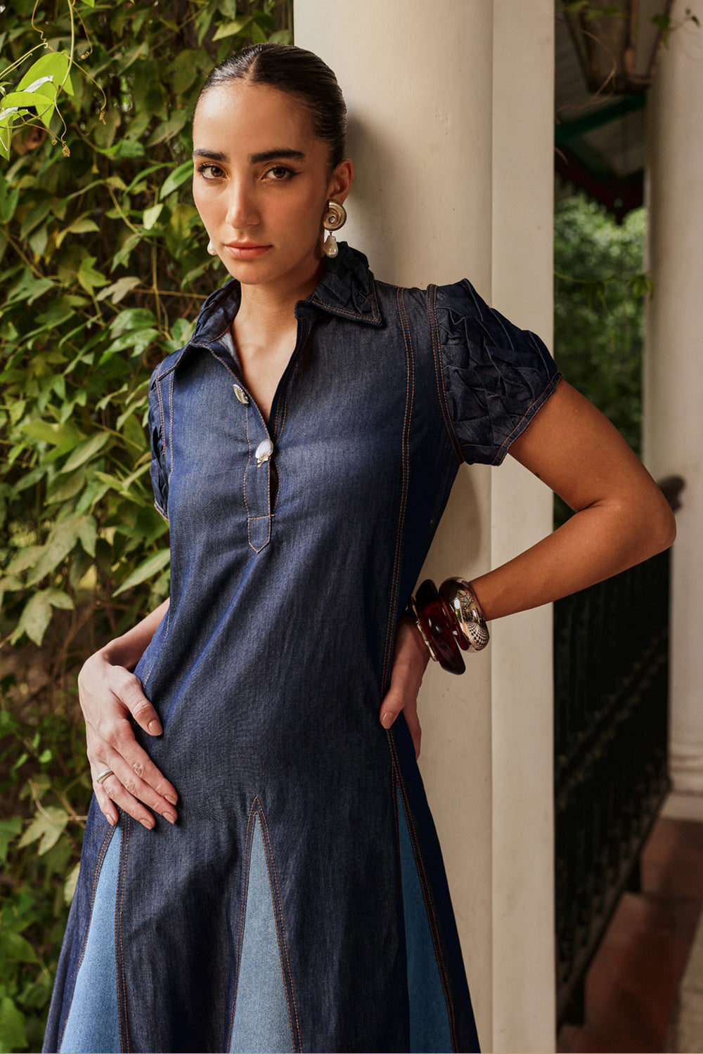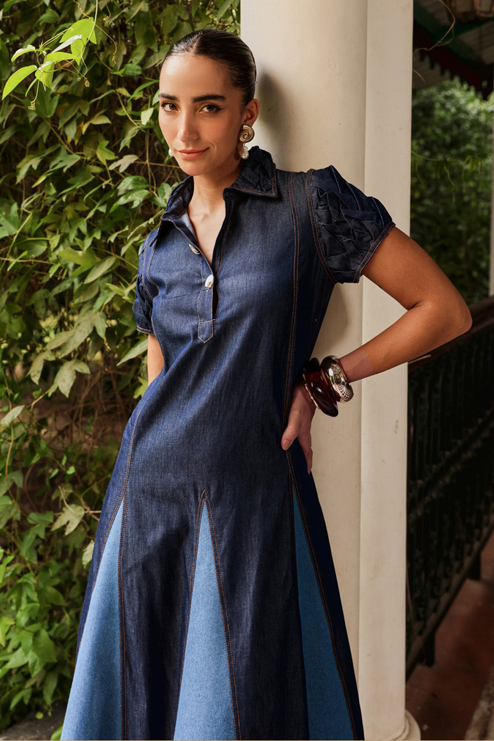The Classic denim dress with beautiful gold buttons and hand smoked sleeves, the contrast mix and match denims detailing.