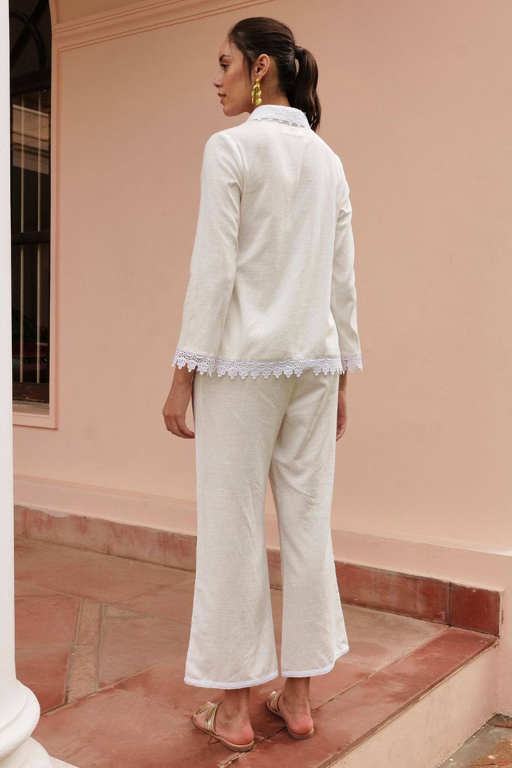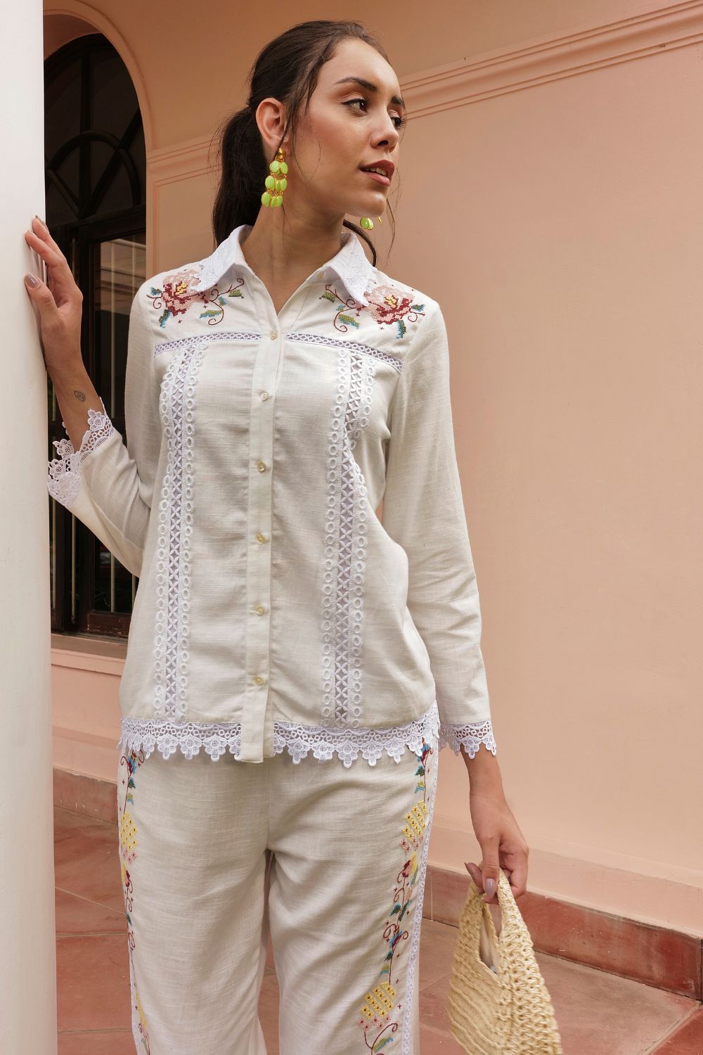 Redefined and flattering. Structured and yet delicate. Beautifully crafted in linen cross stich embroidery and abundance of lace makes this coord set a heads turning statement.