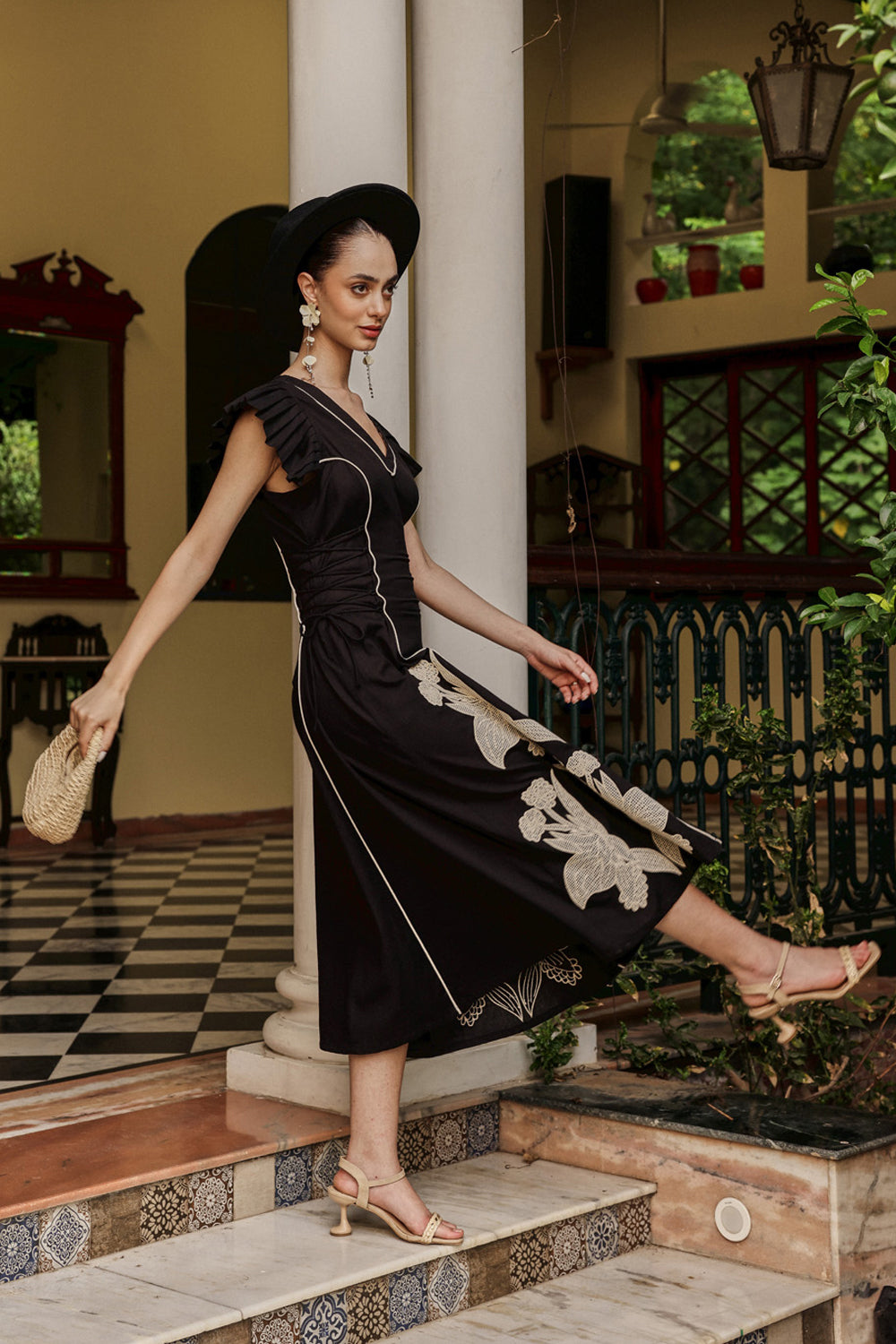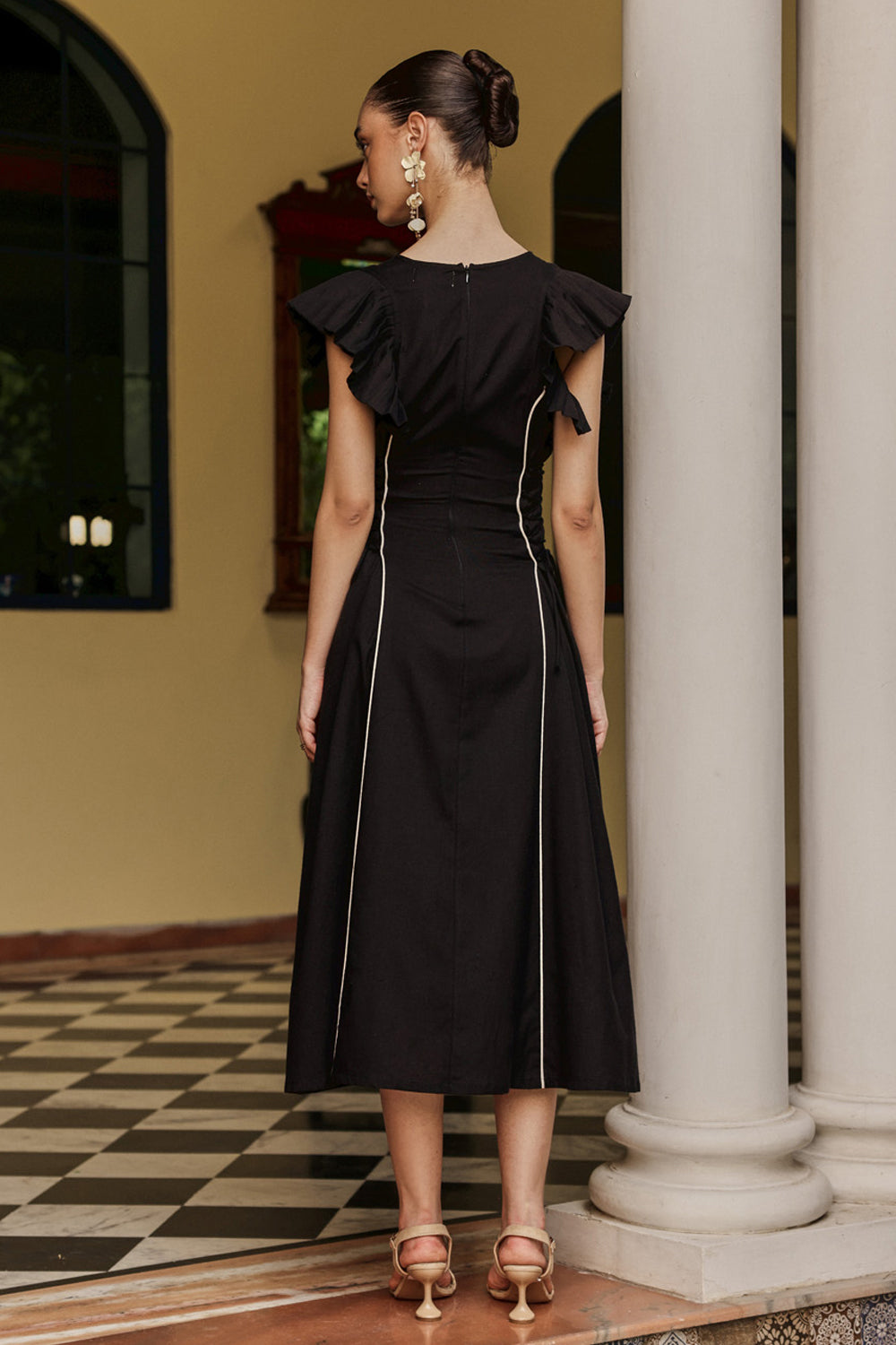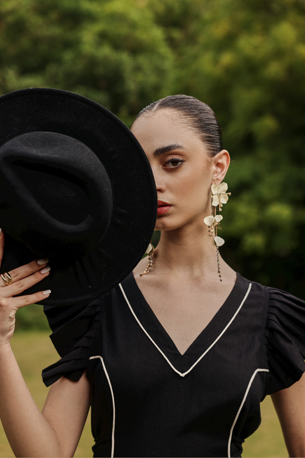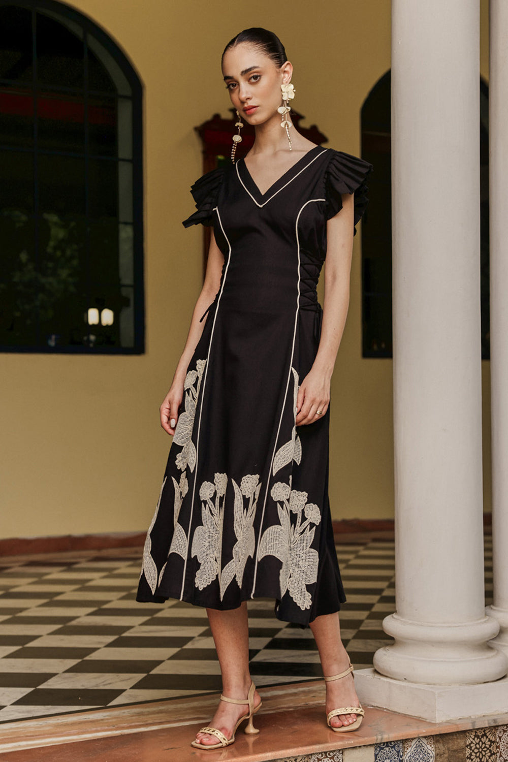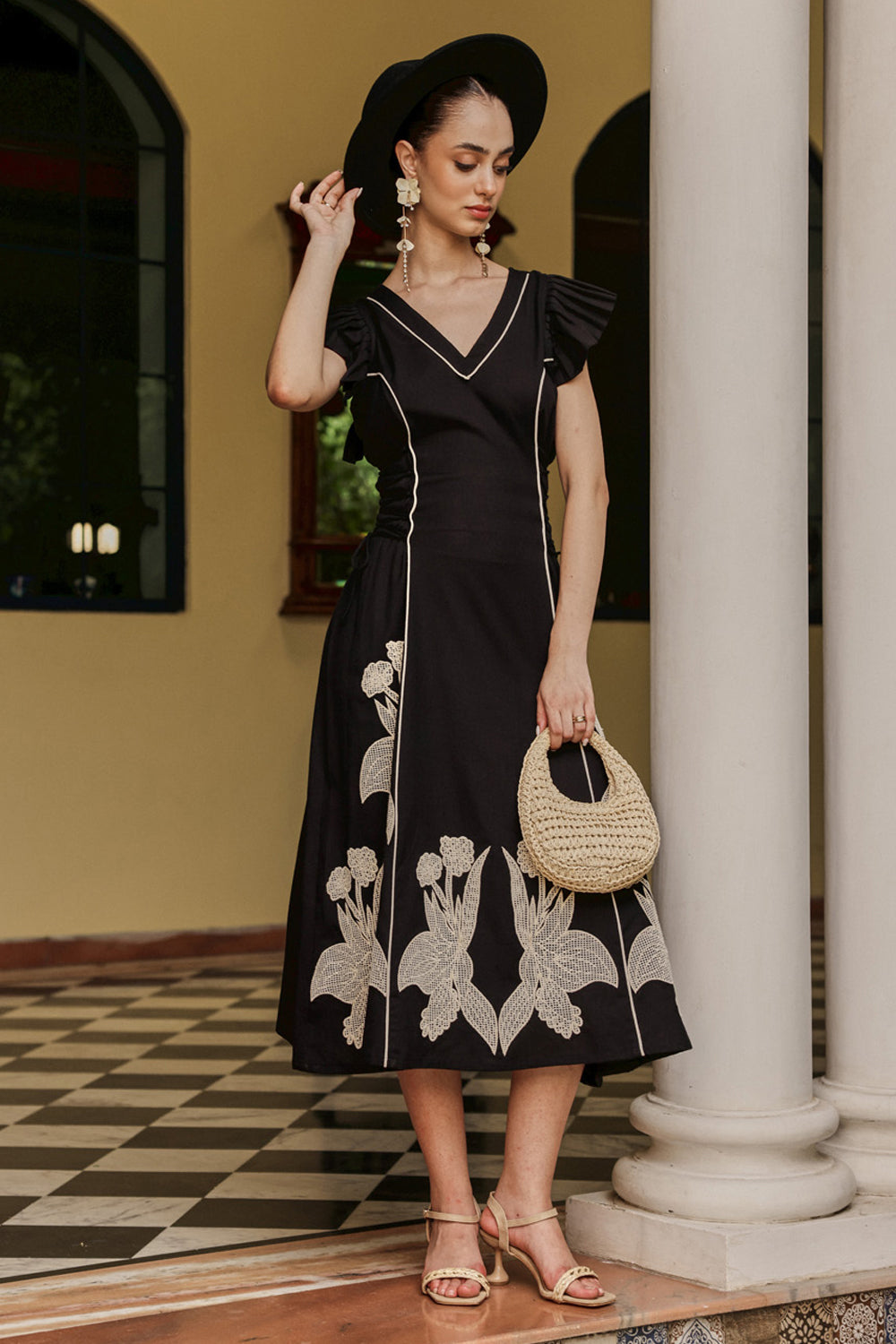 Boho-Chic signature honeycomb embroidered dress with contrast piping on the neckline detailing on the neckline  and the dress.