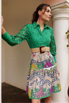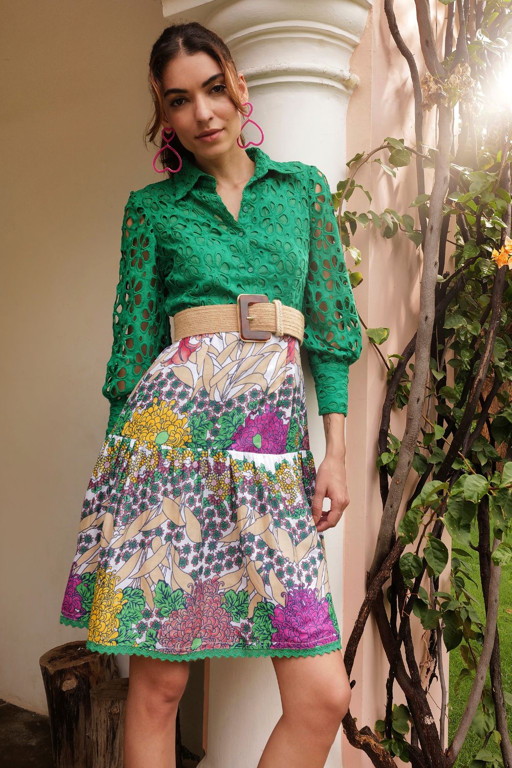 Your go to piece for creating meanigful moments of pure joy. The mix and match emerald green broderie bodice and nature inspired floral print skirt makes this dress a wardrobe staple. Bold shoes and artisnal accessories will make this