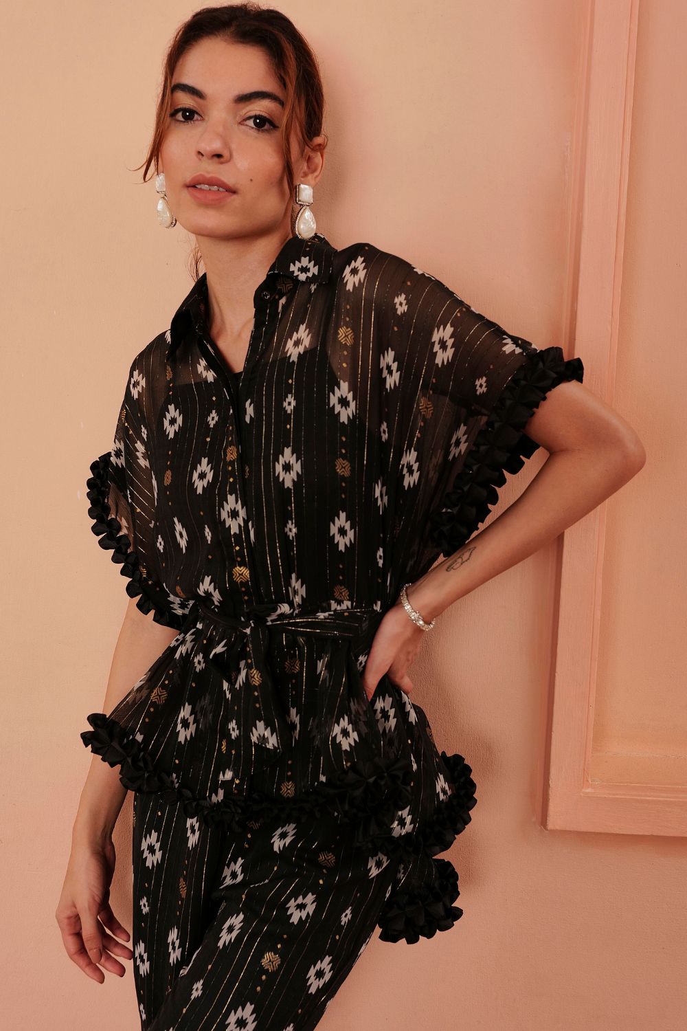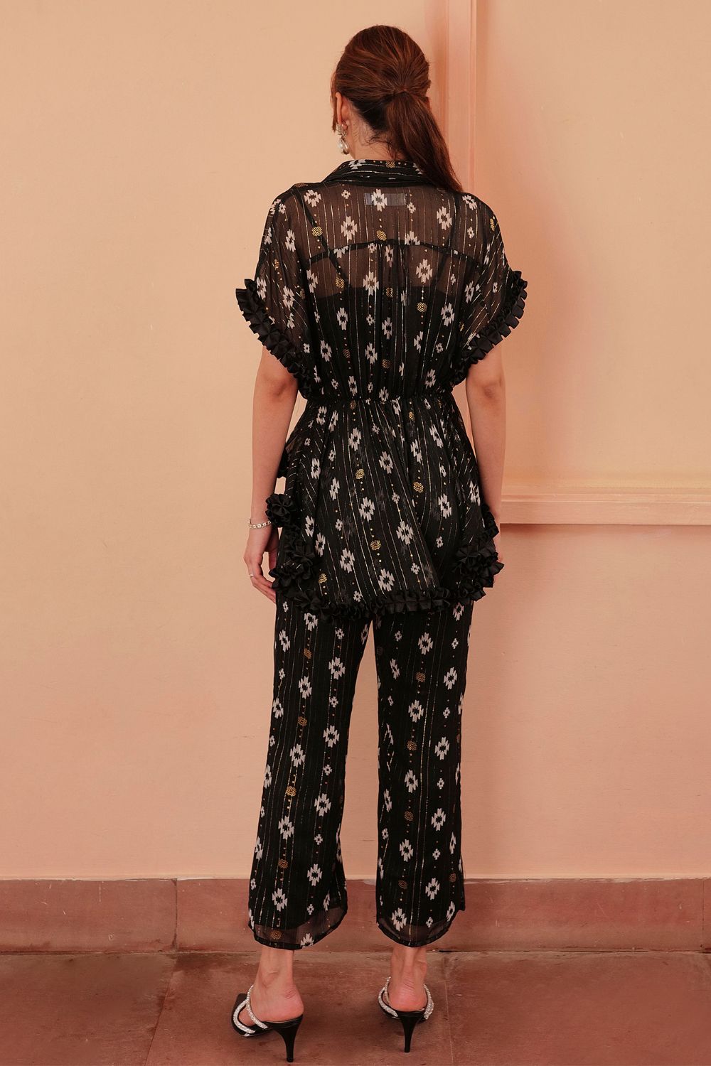 Be the reason why everyone turns their head with this mettalic print matching set with beautifully tailored ribbon work.