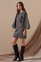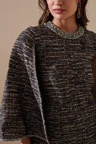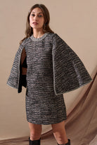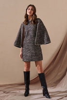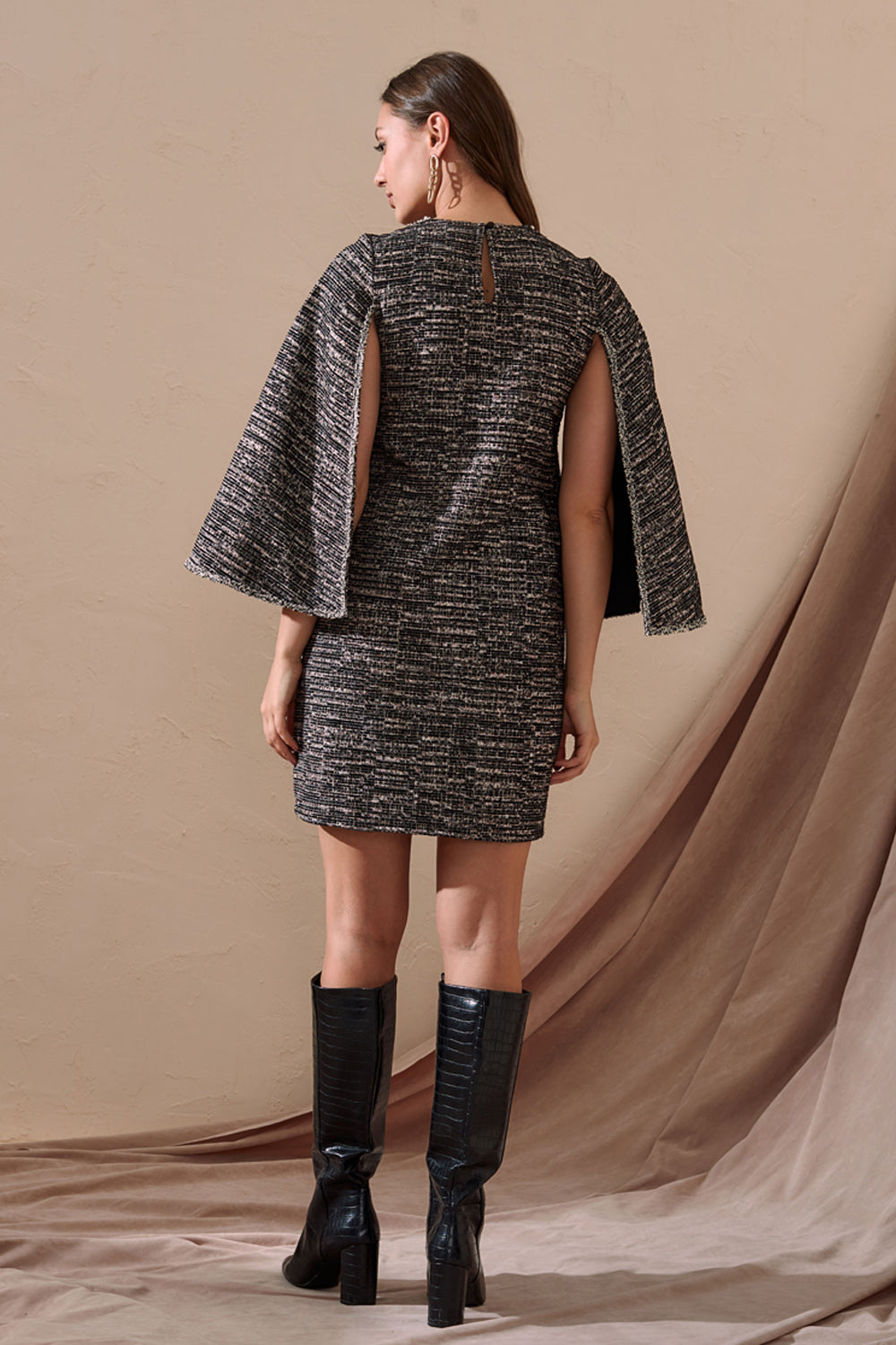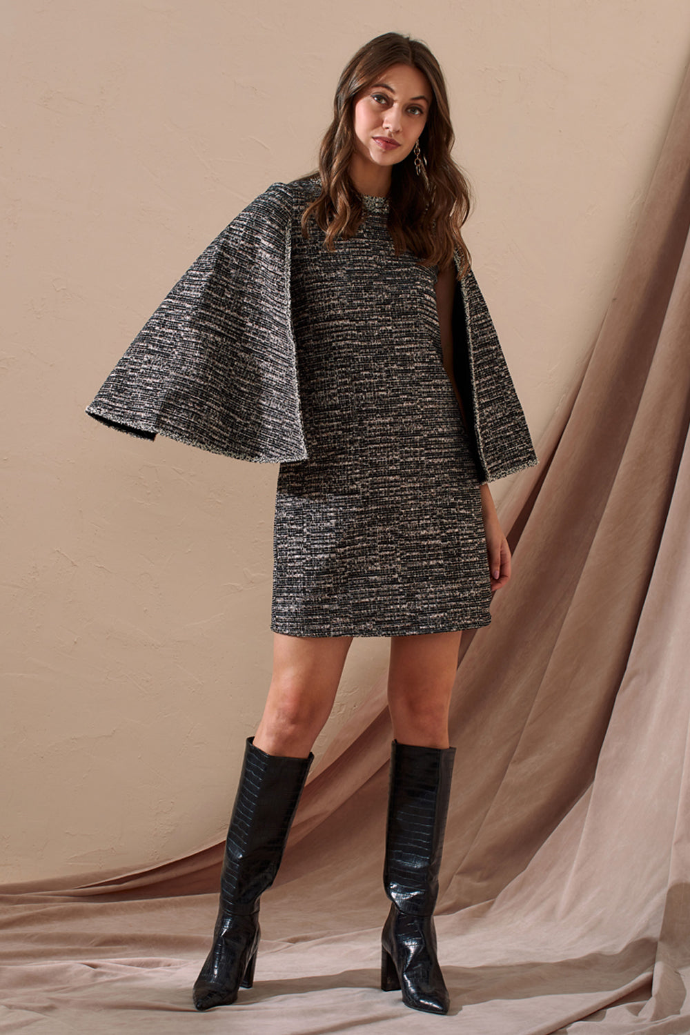 Tweed cape sleeved dress detailed with a shimmer tweed lace and pearls for that perfect winter brunch.