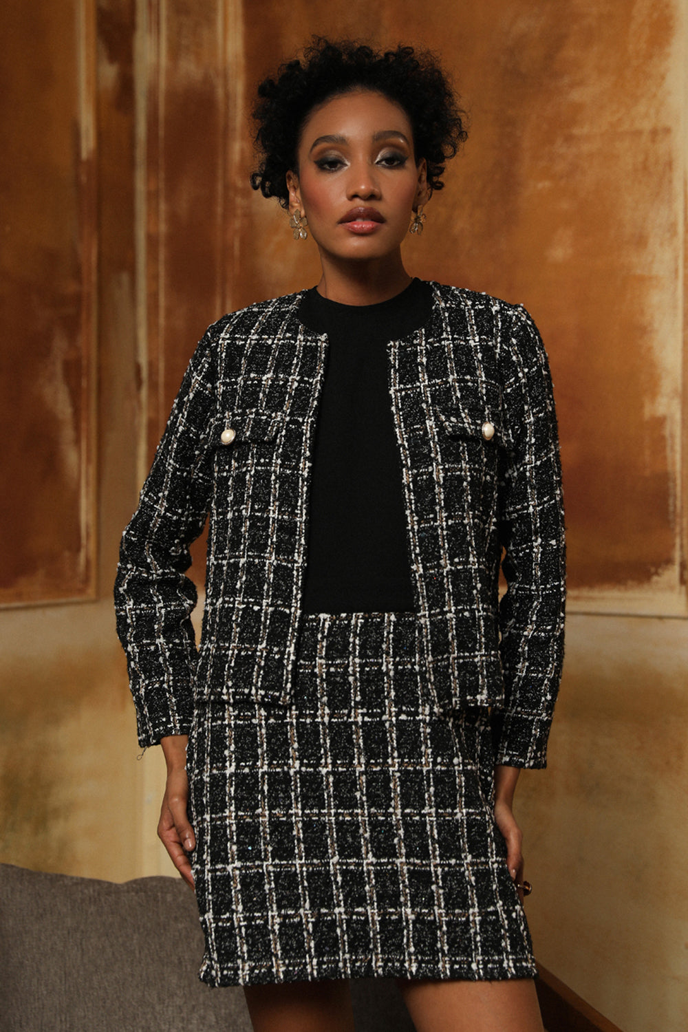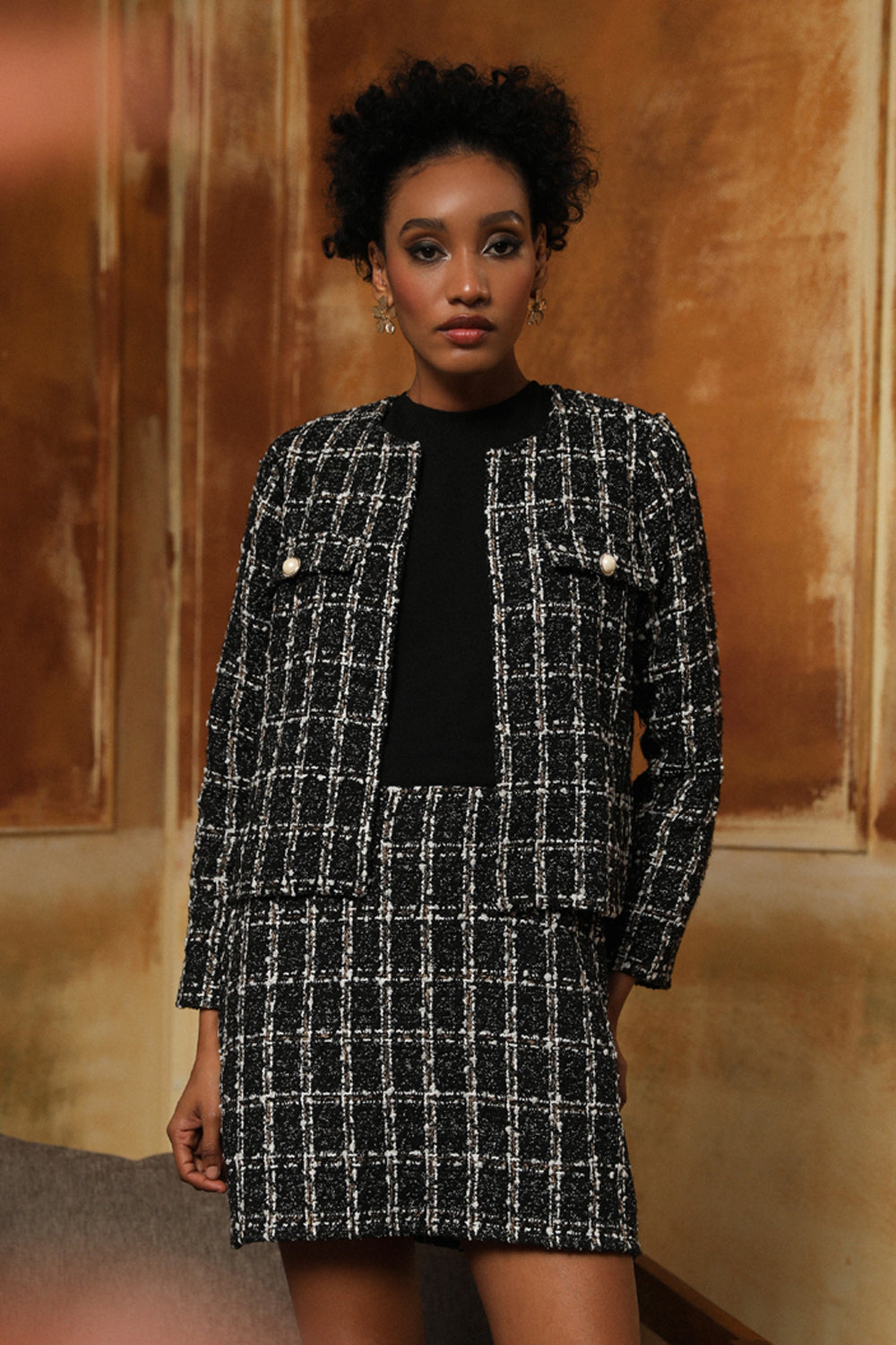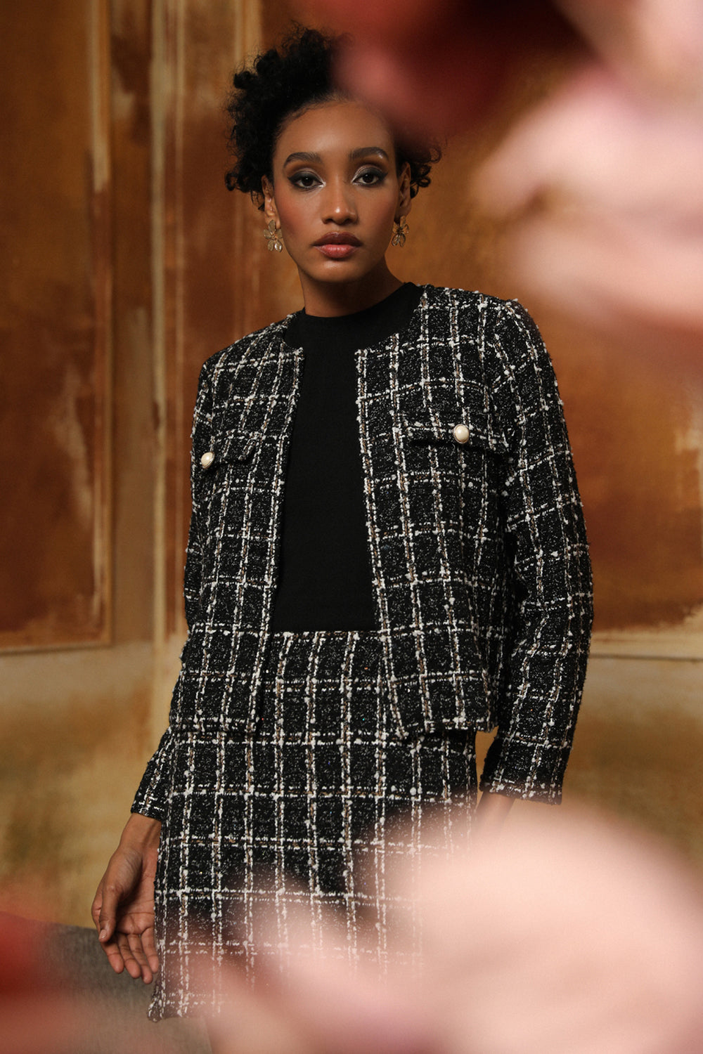 Beautifully crafted tweed dress. The skirt and the jacket are in tweed. The beauty of this dress is that one can wear the jacket as a separate and the dress without the jacket as well.