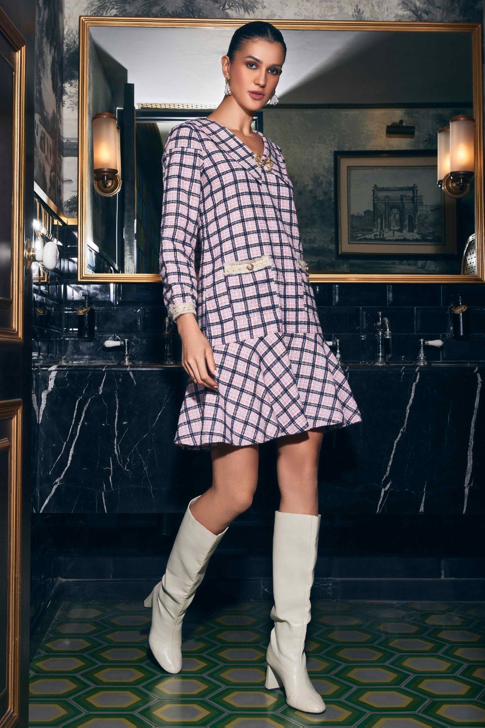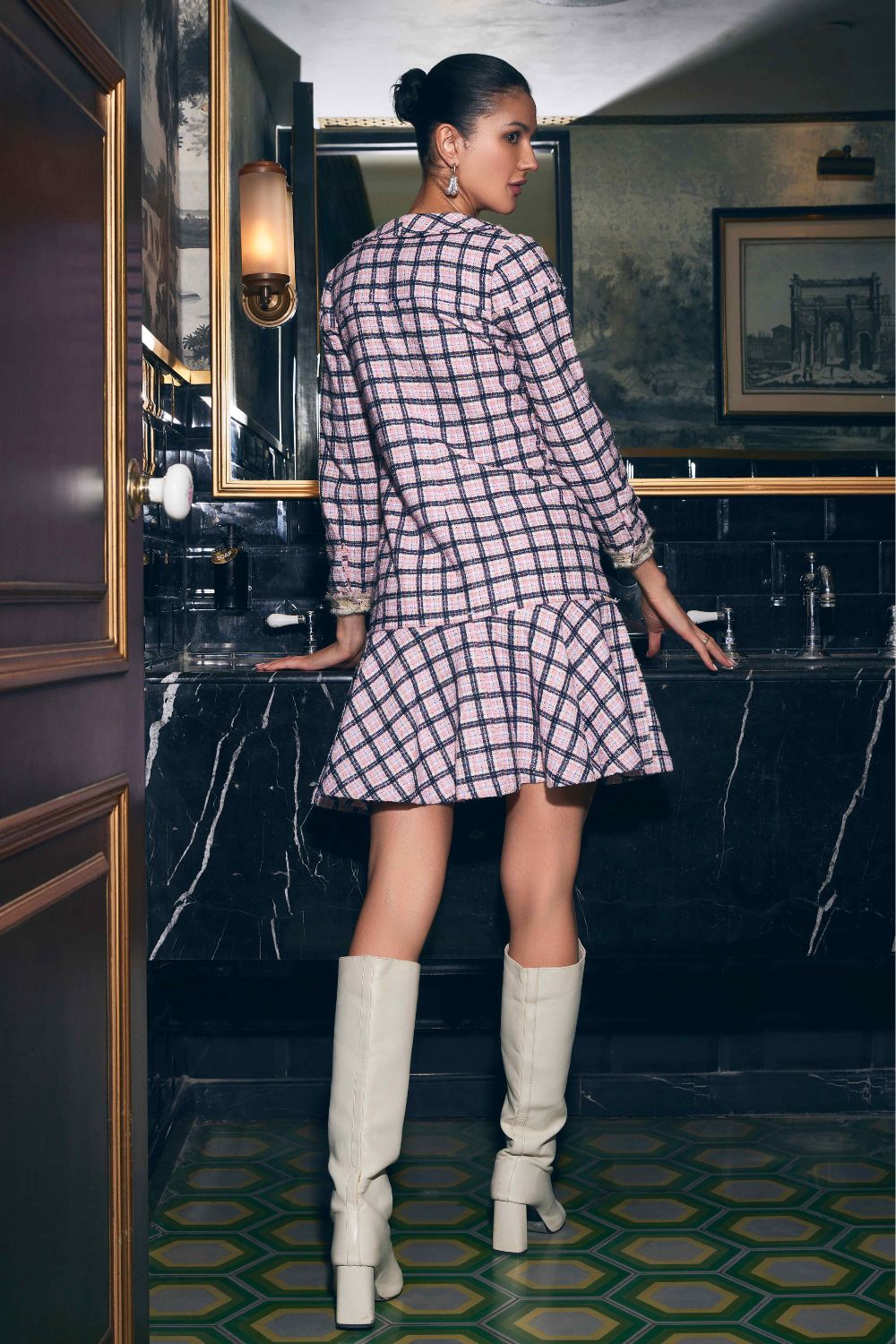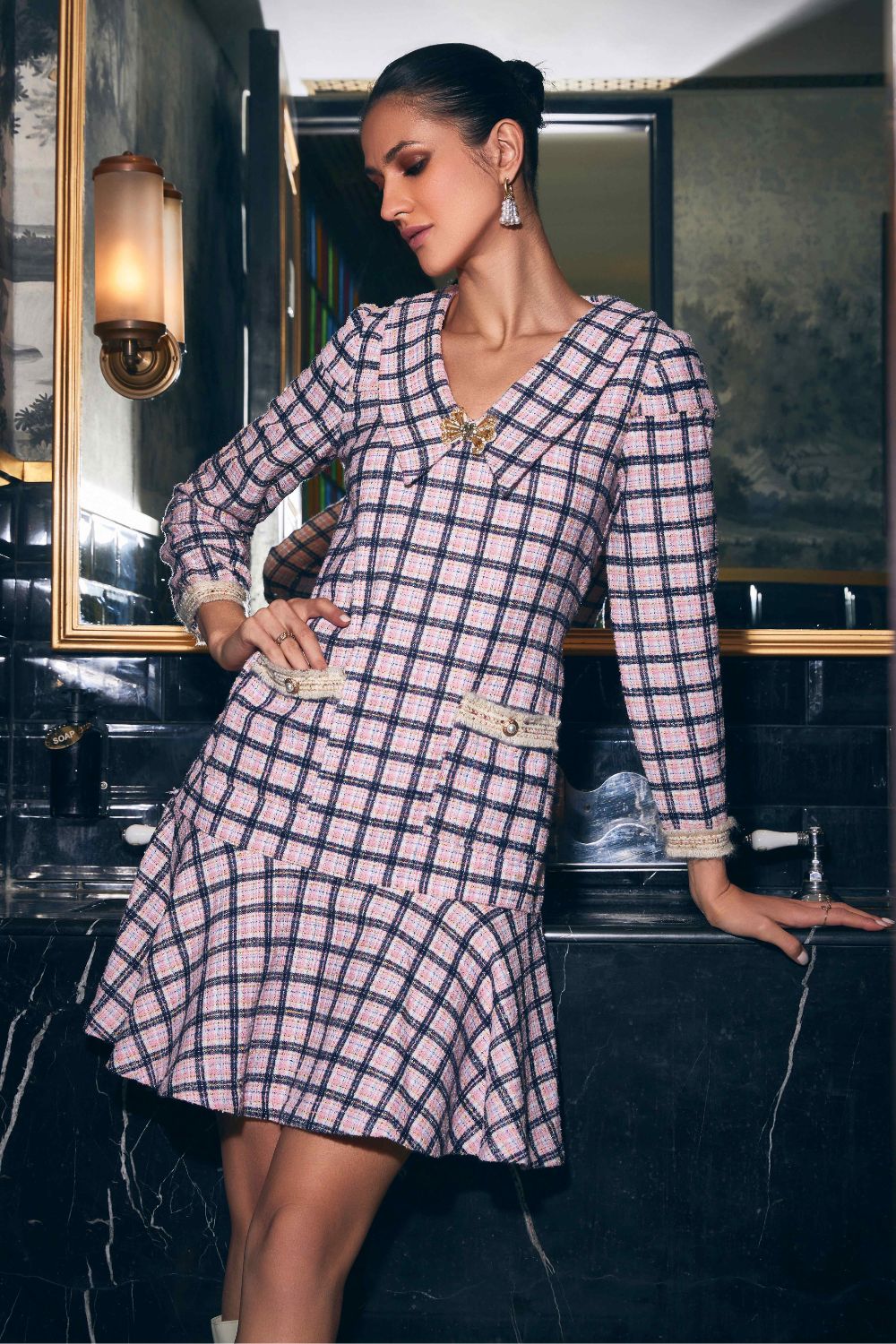 A Boho-Chic exclusive this plaid metallic tweed dress with a beautiful broch and side pockets withe a beautiful tweed lace trims.