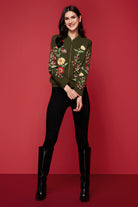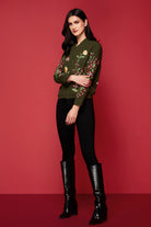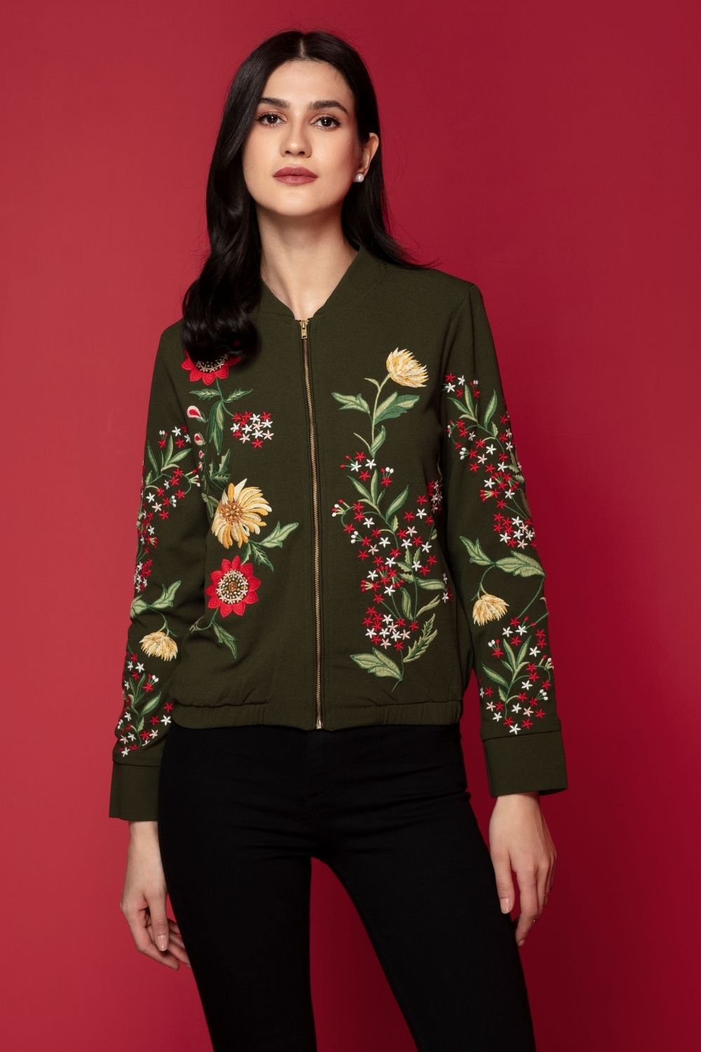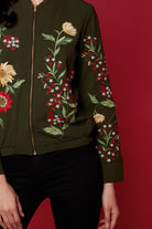 Flattering and a boho-chic exclusive.Allover embroidered and beautifully crafted bomber jacket.