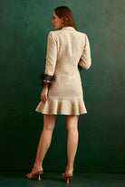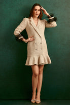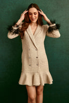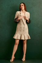 Metallic tweed blazer dress detailed with feather trimmed sleeves and ruffled bottom hem. This silhouette is surely a statement piece for your winter wardrobe. Pair it with knee high boots or high heels to sure make heads turn.