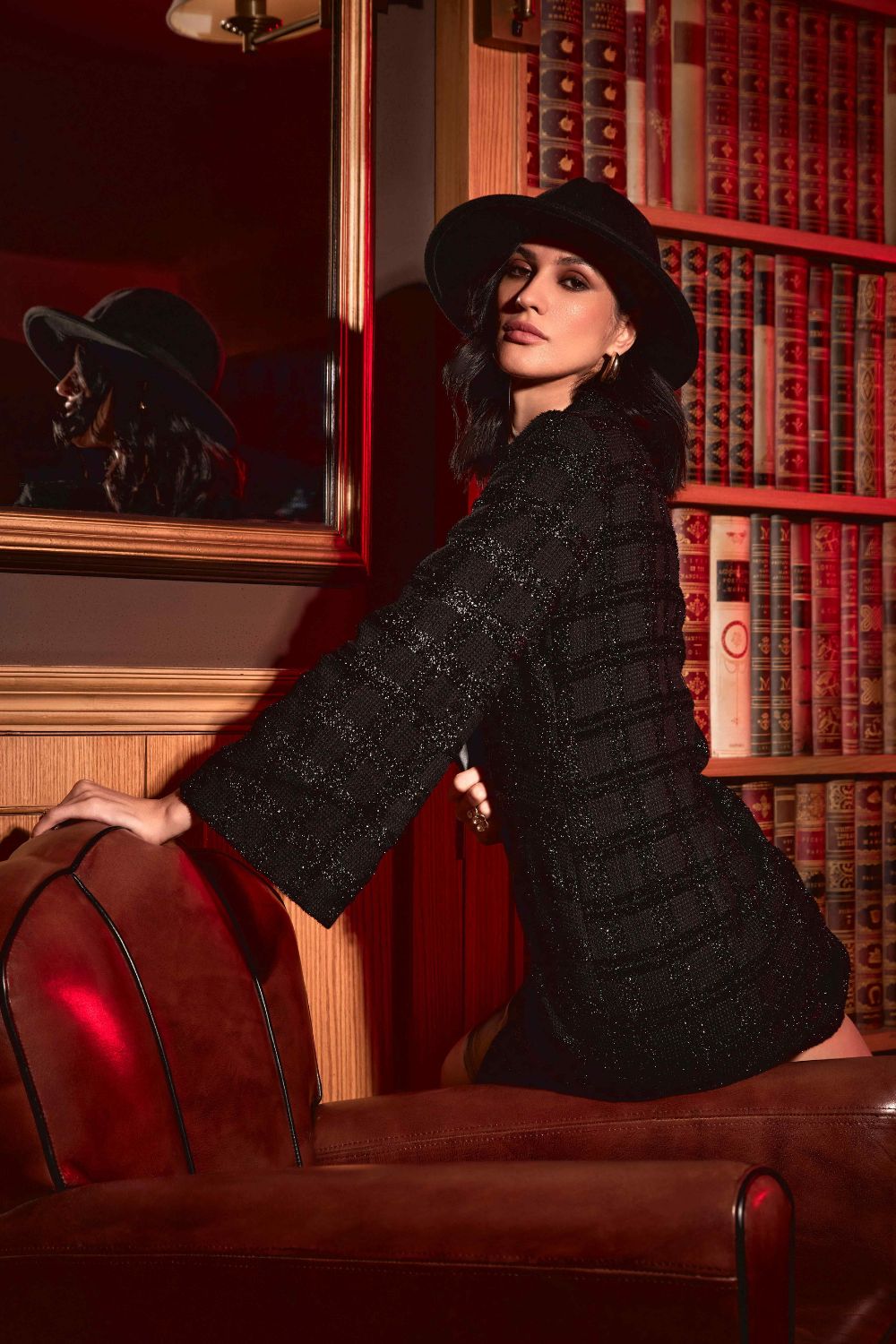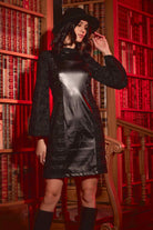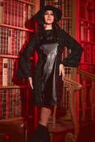 Trendy and Classic exquisite tweed dress with faux leather trims, Pair it with knee high boots for that event ready ensemble.
