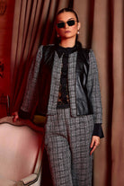 Classic monochrome coord set crafted in fine weaved sequinned tweed jumpsuit with faux leather detail and side pockets.