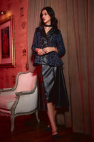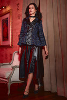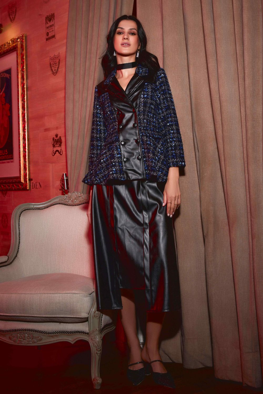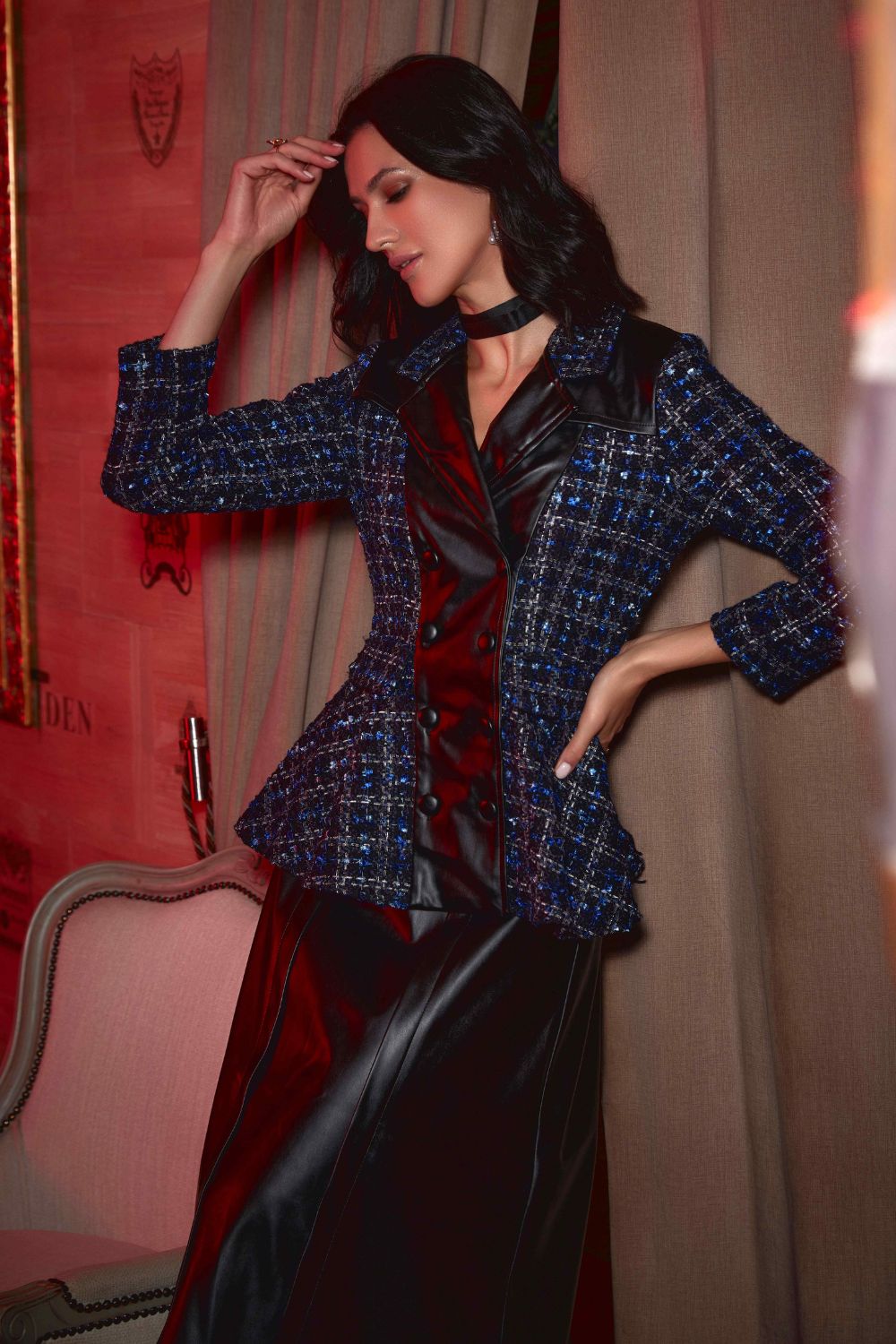 Embodying sleek sophistication and feminine allure with its striking and exquisite tweed and faux leather.All tailored into a beautiful structured double breasted peplum jacket.