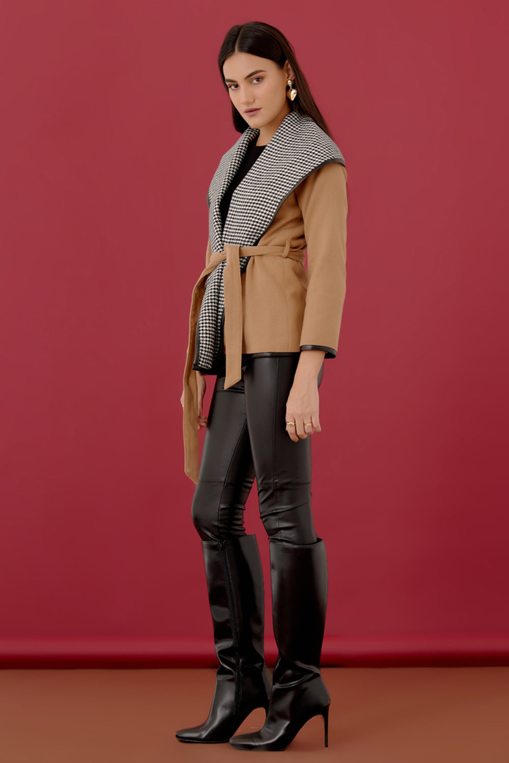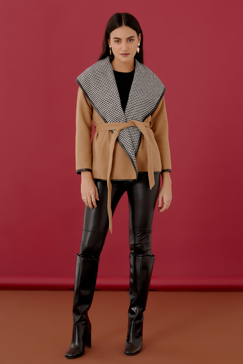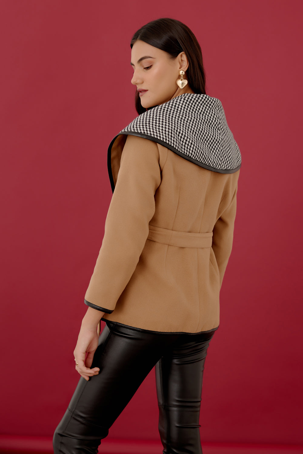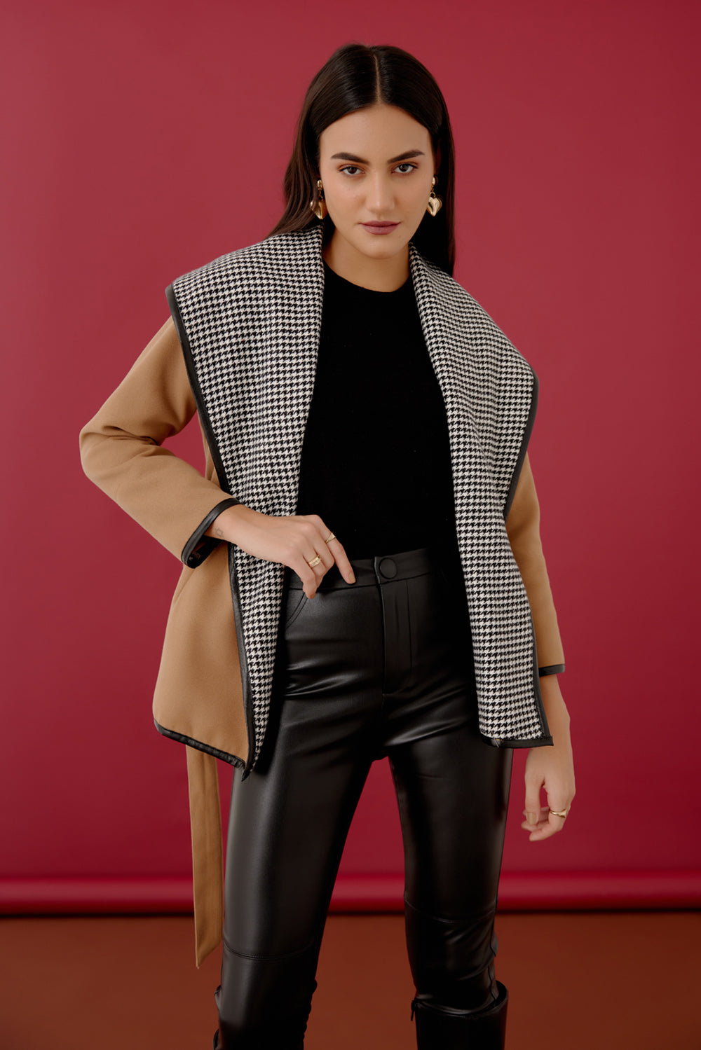 Flattering and a Boho-Chic exclusive. Lined with Houndstooth fabric and detailed with leather trim this beautifully crafted coat is surely a must have for a winter wardrobe.