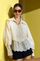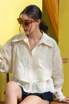 Beautifully crafted broderie blouse with all over palm pattern and scalloped bottom hem.