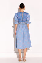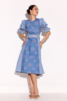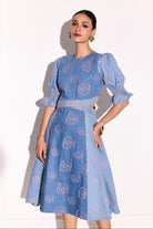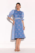 Applique & embroidered roses all over on two tone denim, top stitch, side cut outs and panelled midi dress.Feminine and flattering.