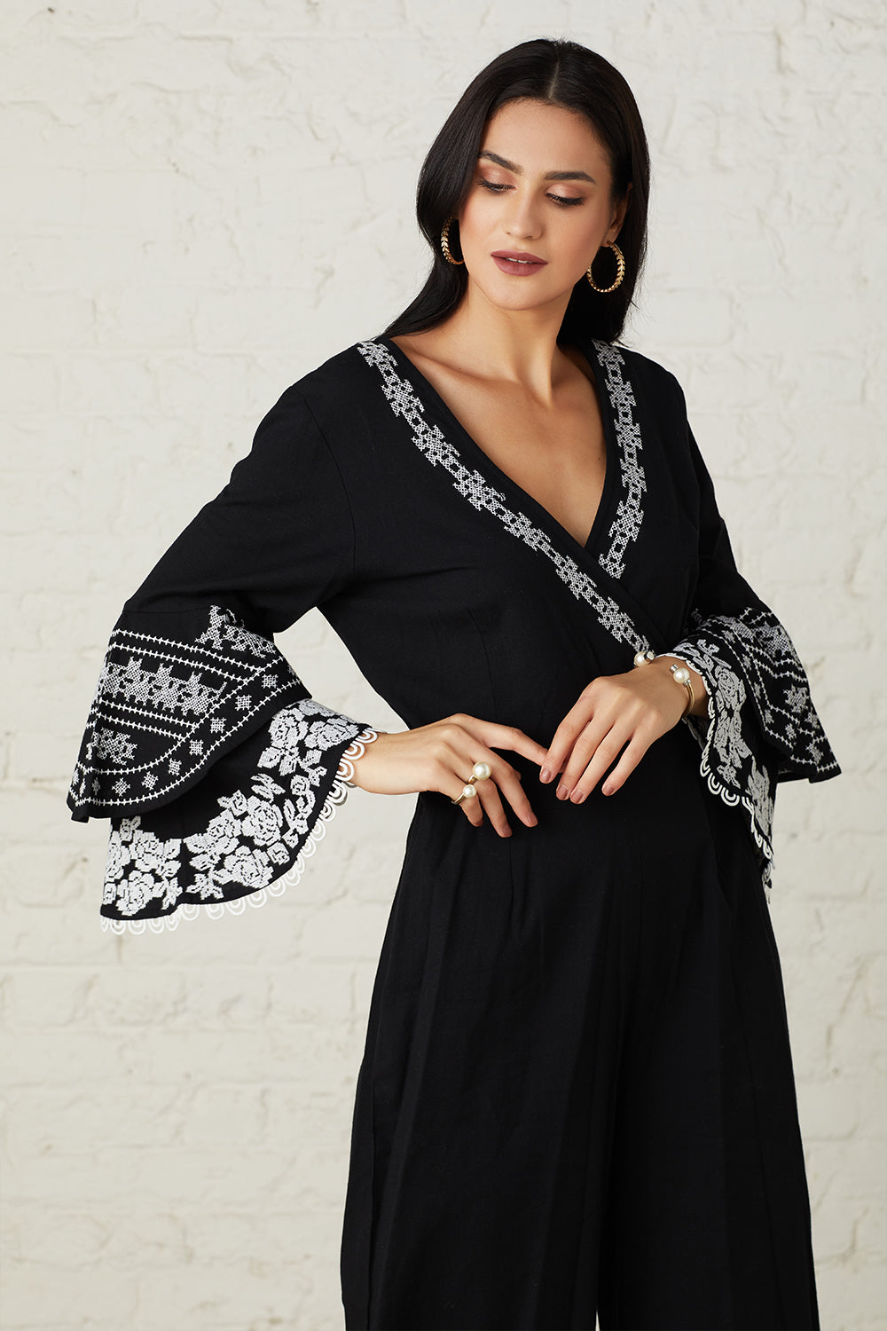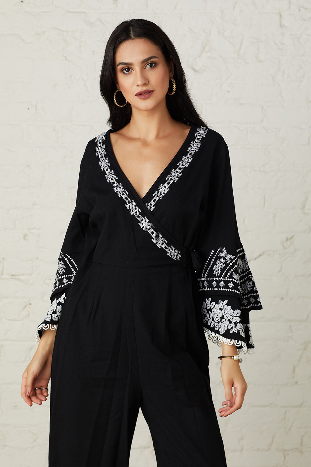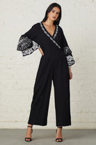 Featuring exquisite cross stitch embroidery, lace detailing and bell sleeves. This monochrome jumpsuit is a classic must have. Inspired by the vintage and the modern.