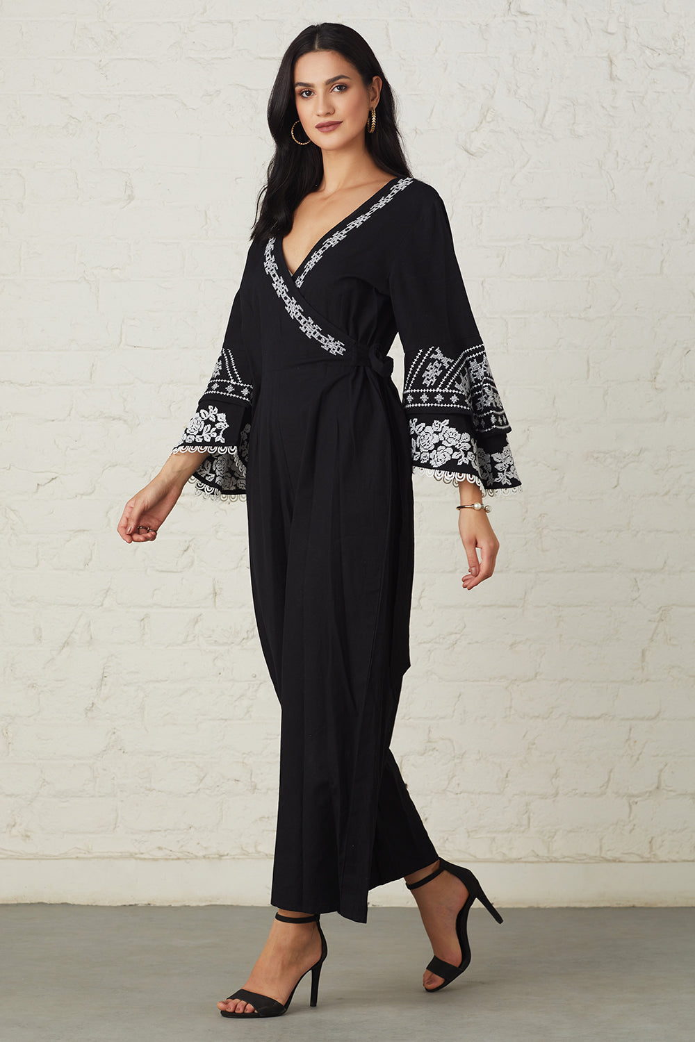 Floral embroidered bell sleeved Monochrome jumpsuit