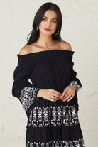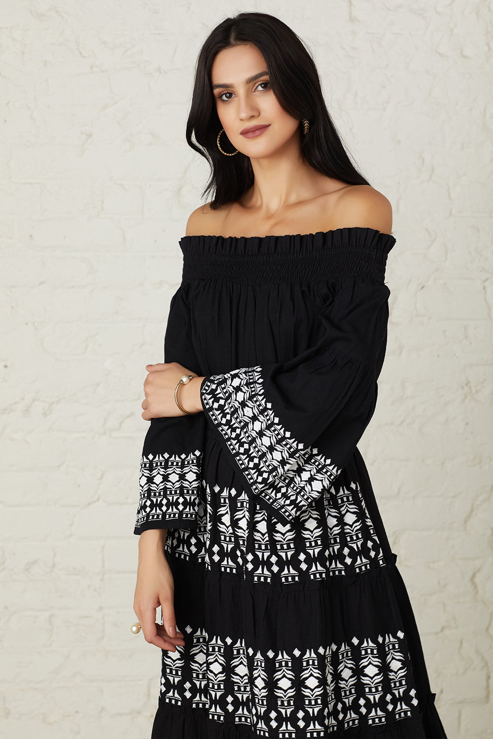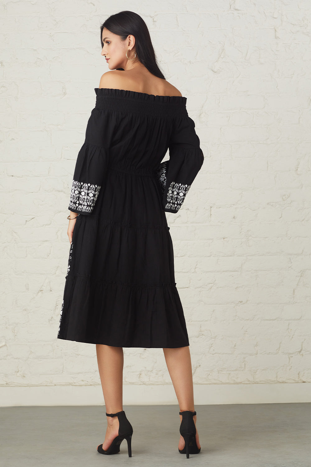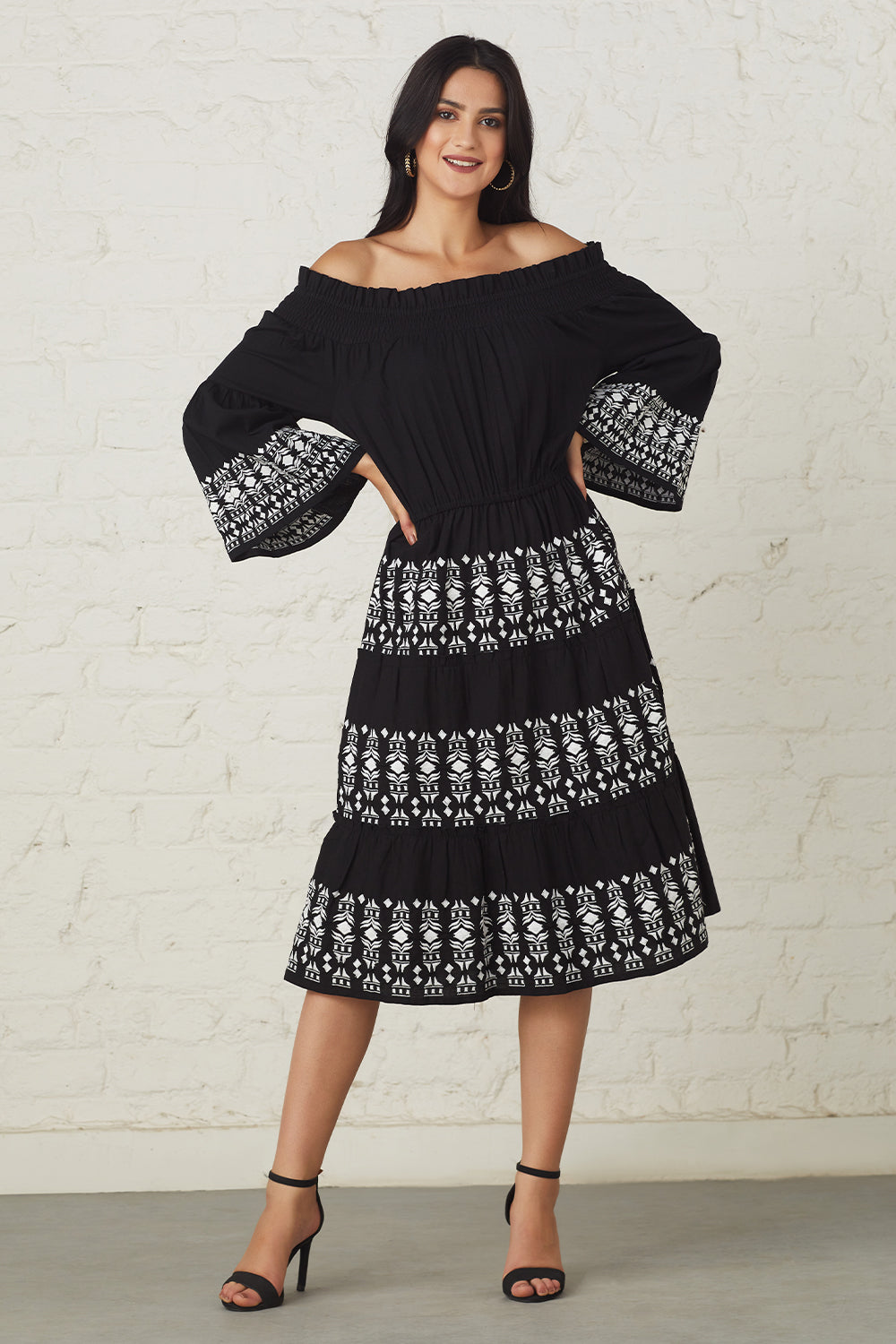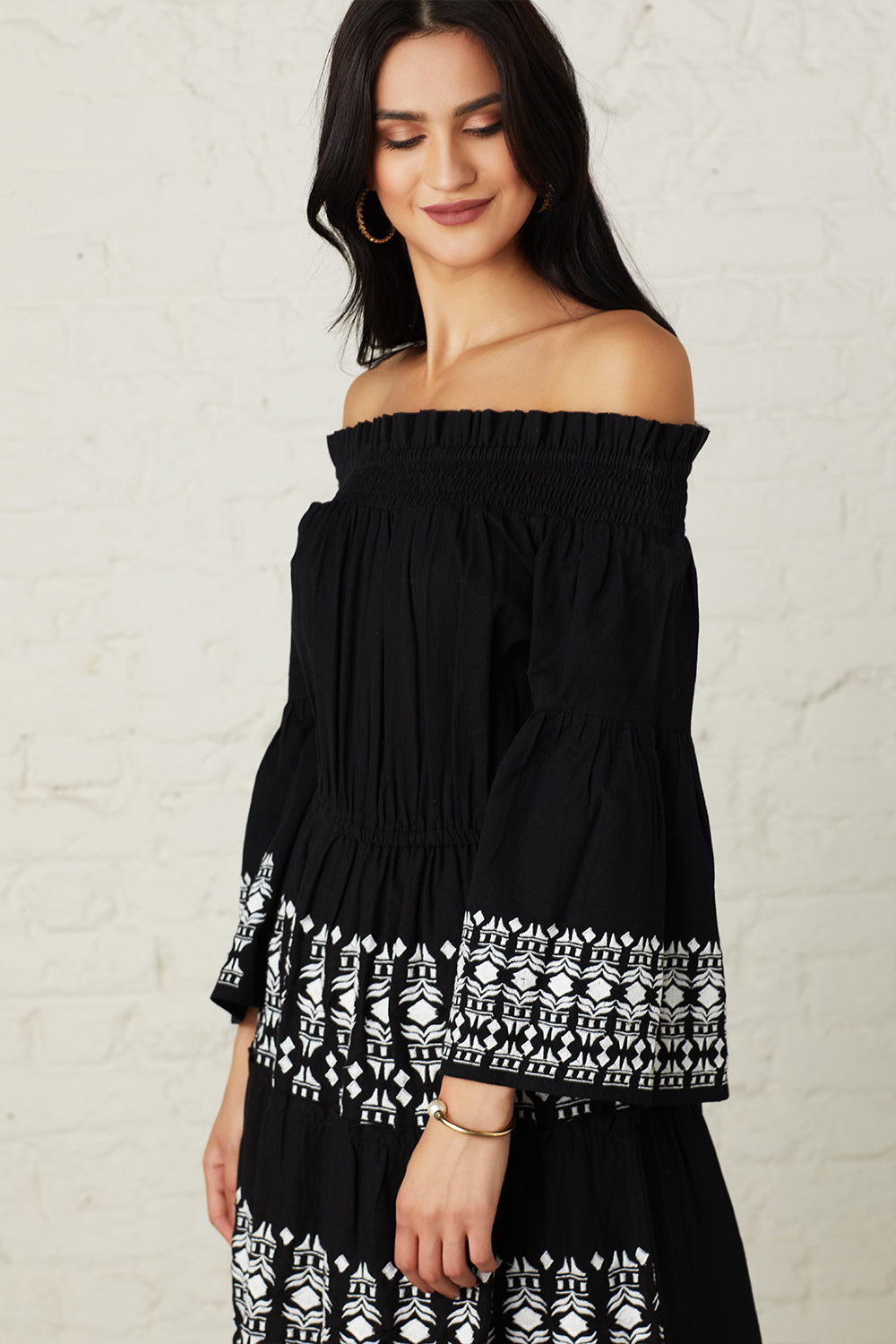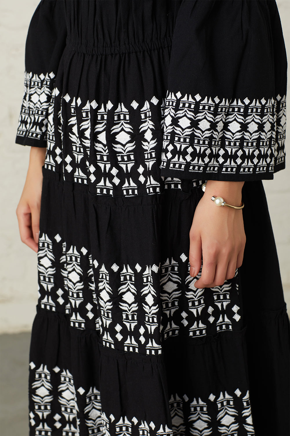 Designed with the modern traveller in mind, This midi tiered dress is feminine, flattering and versatile. The intricate embroidery gives a luxe bohemian aesthetic to the silhouette.