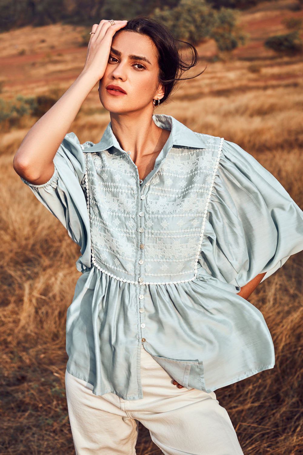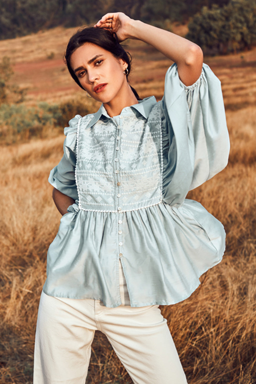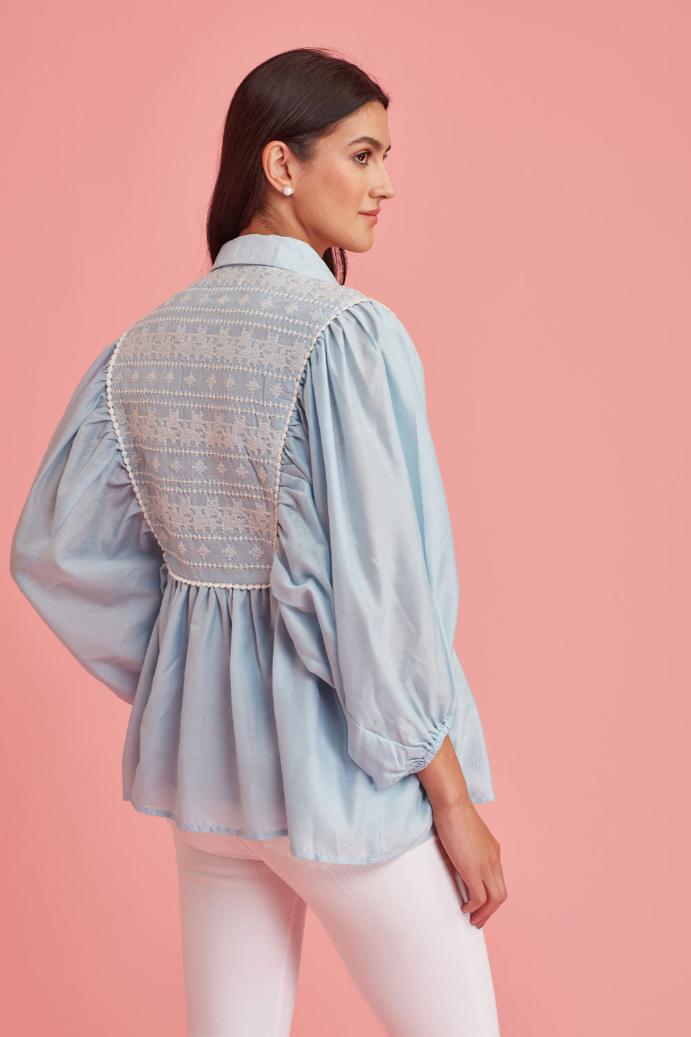 Intricately embroidered yoke front and back with gathered sleeves. This luxurious piece could seamlessly transition between elegant occasions and the everyday.