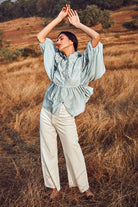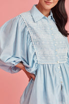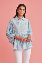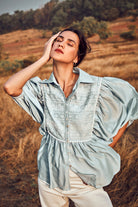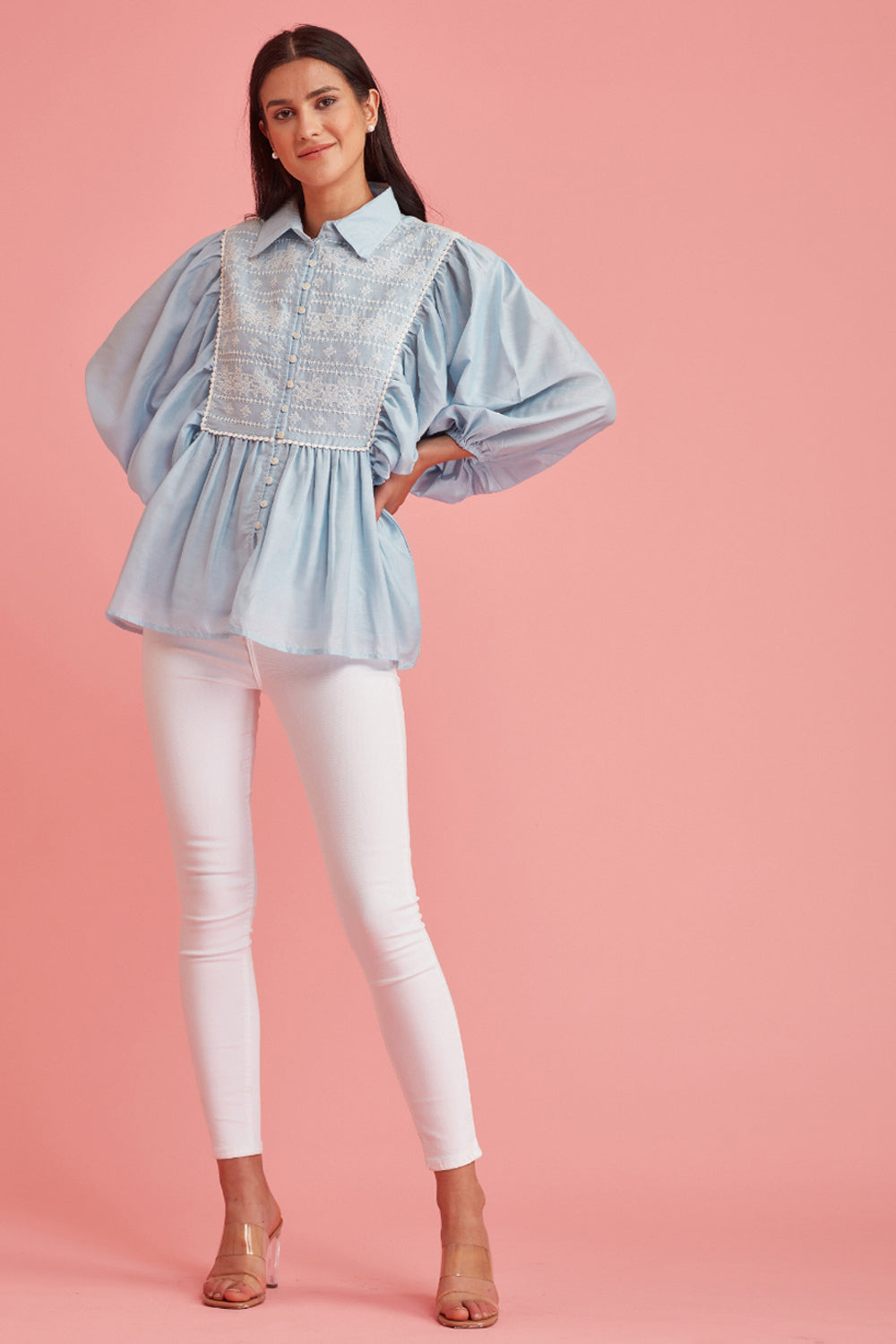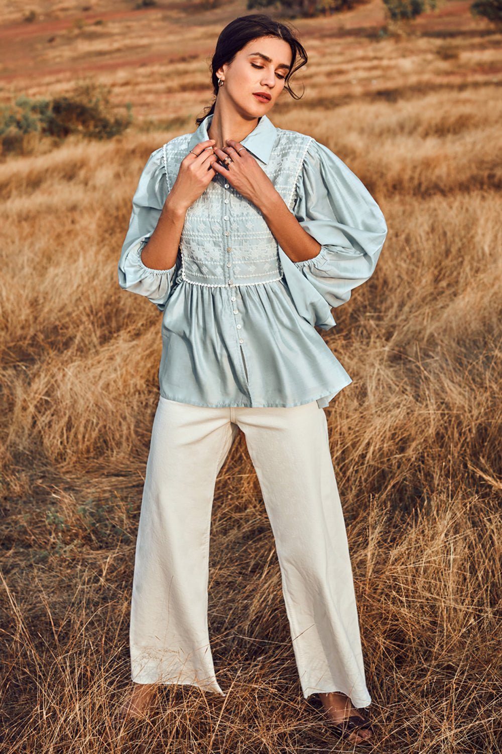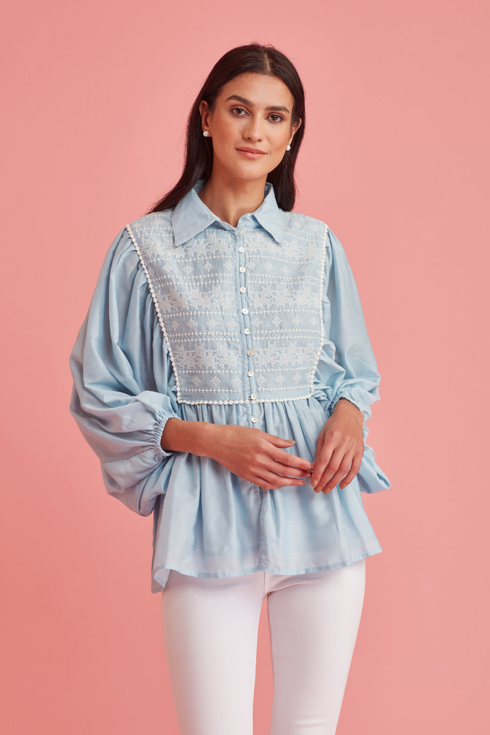 Intricately embroidered yoke front and back with gathered sleeves. This luxurious piece could seamlessly transition between elegant occasions and the everyday.