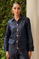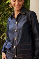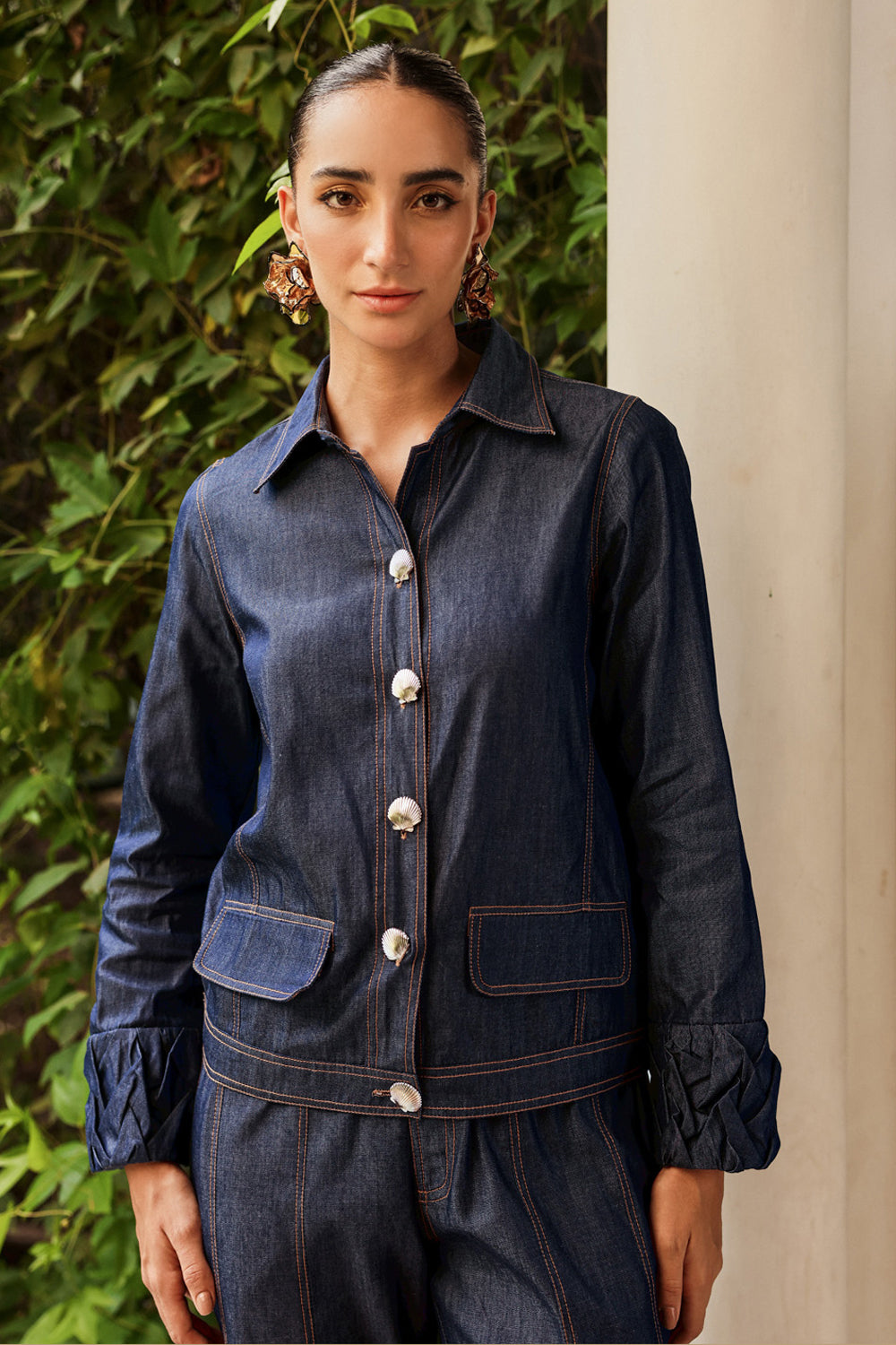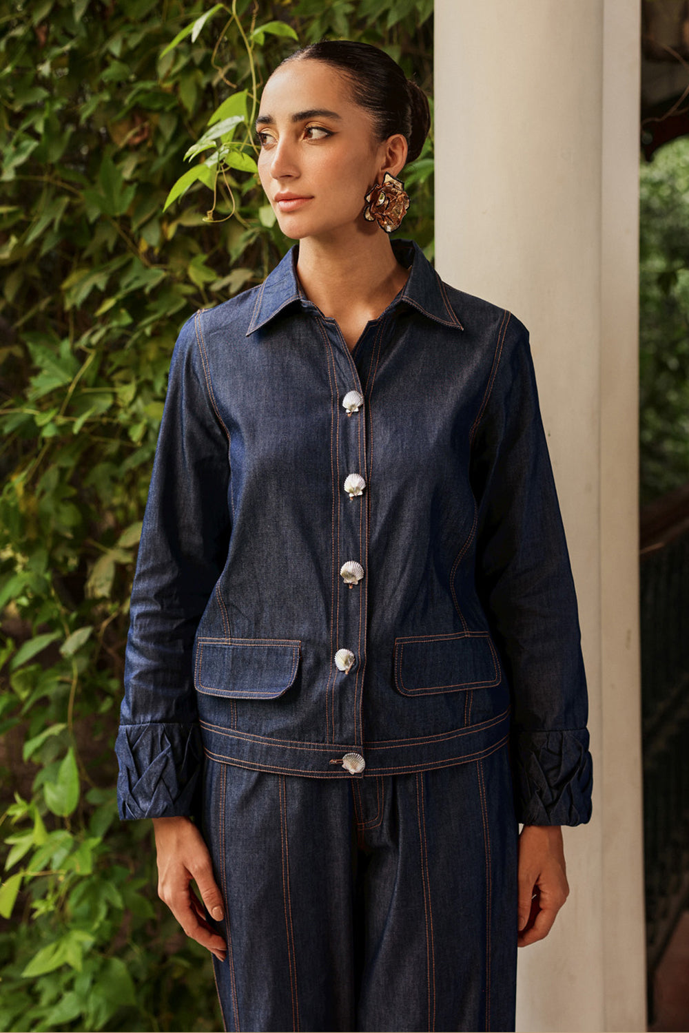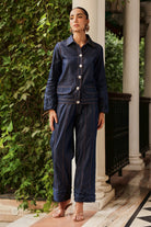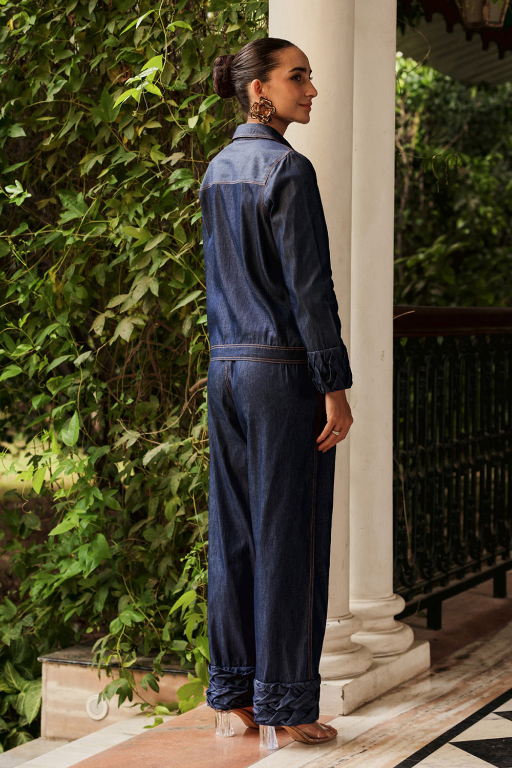 The Classic denim co-ord set with beautiful gold buttons and hand smoked collar and sleeves hem and bottom hem of pants.