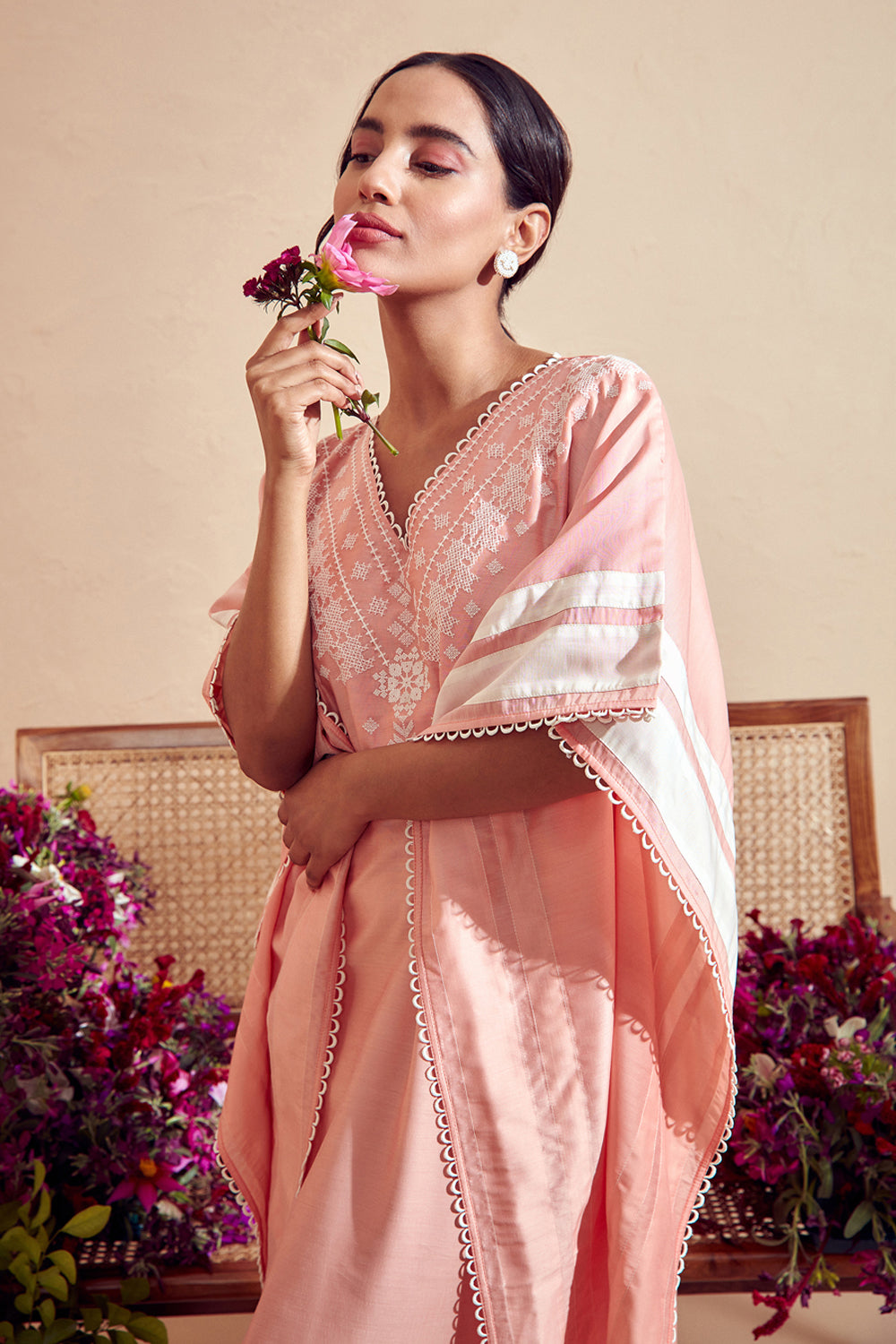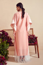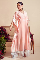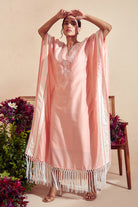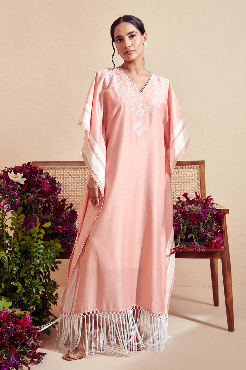 Embroidered in pastel hues trimmed with lace and tassels lends this kaftan an air of breexy elegance.