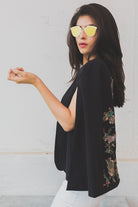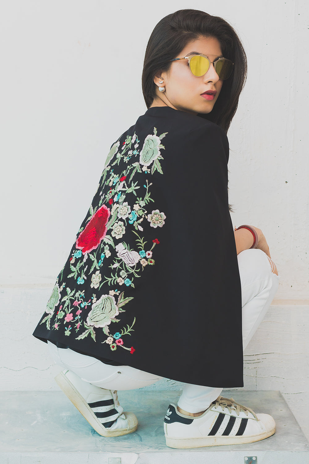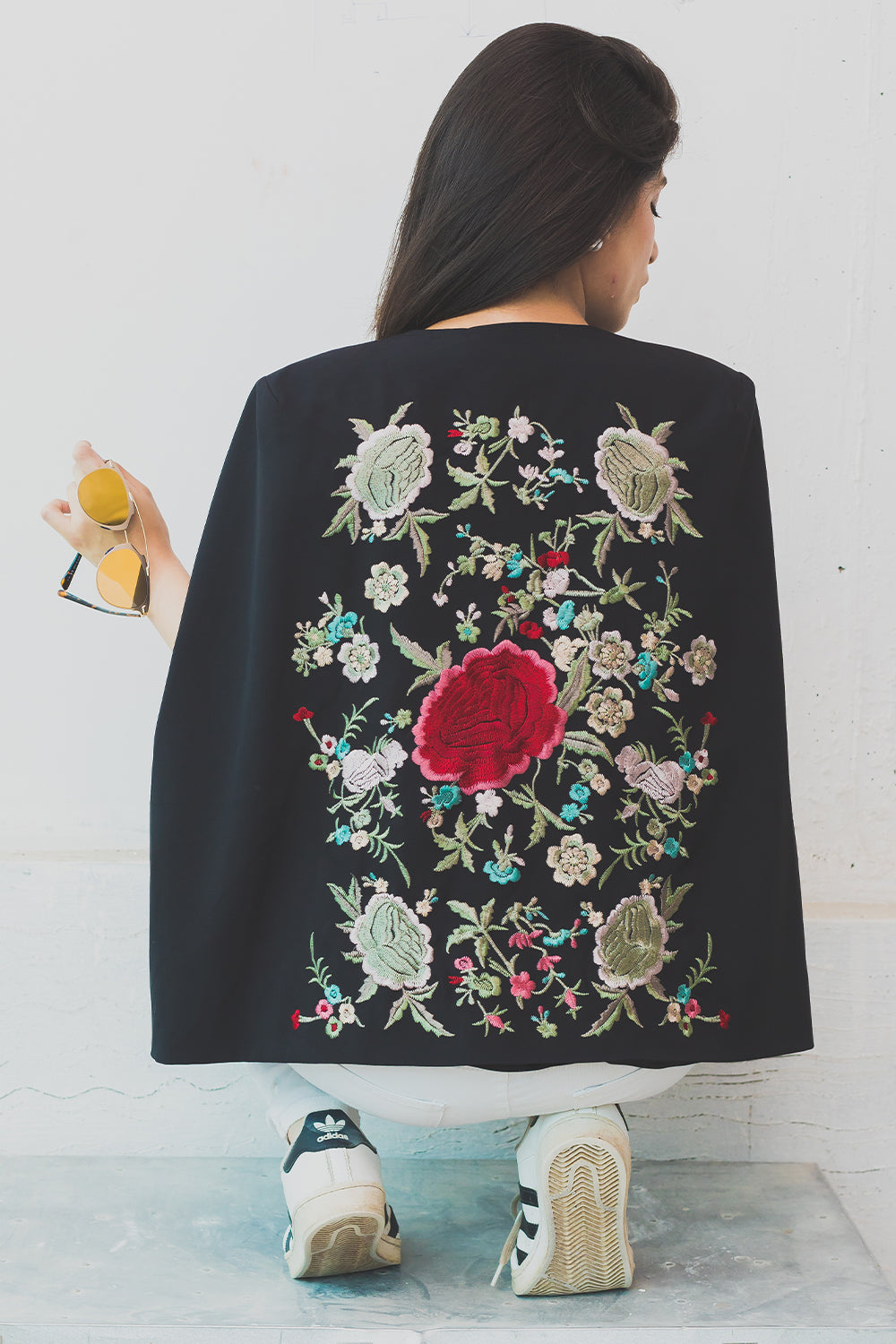 This cape is beautifully embroidered with multi coloured threads. The High quality silhouette includes emphasis on specialty fit. An elegant staple. A Boho-Chic exclusive.