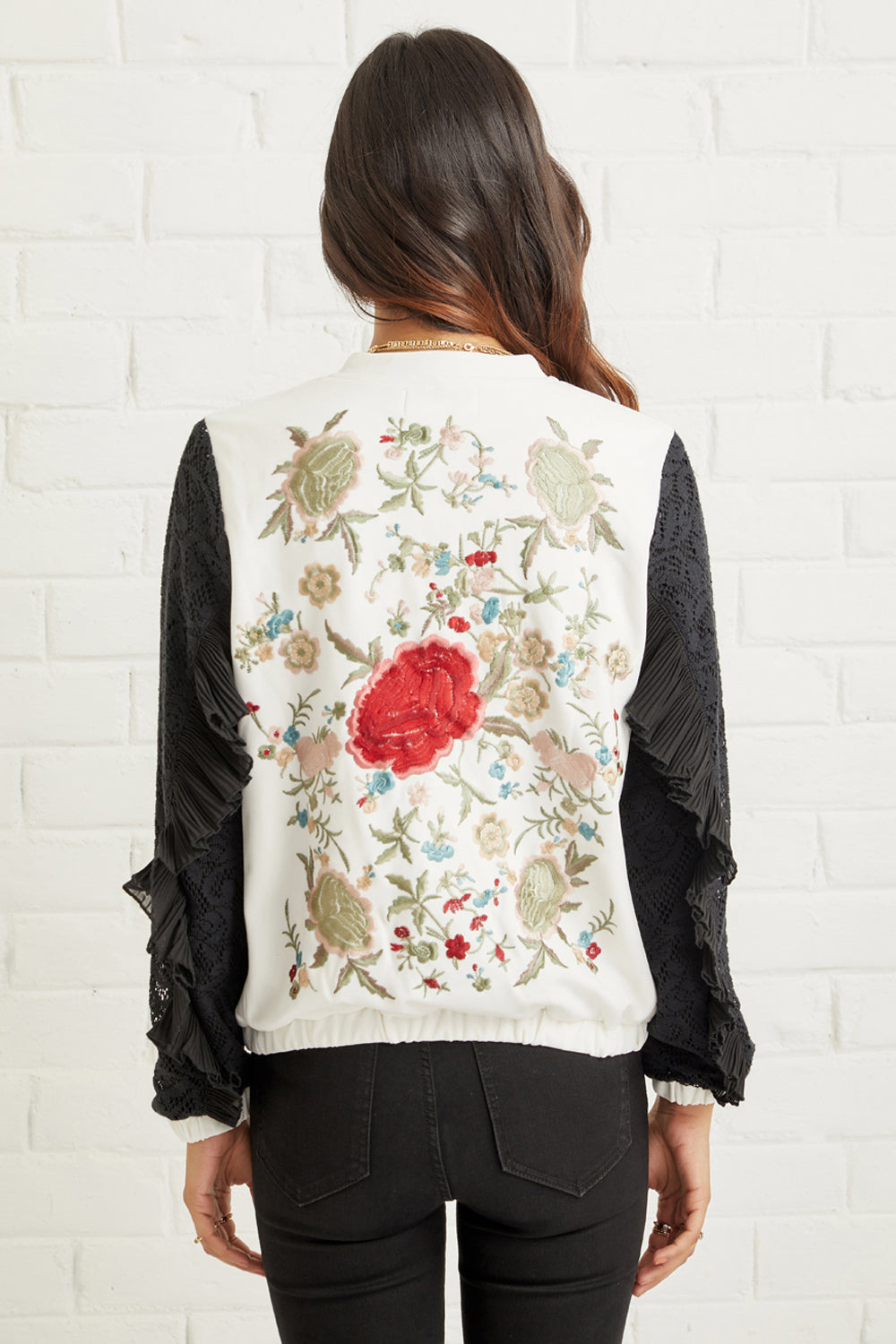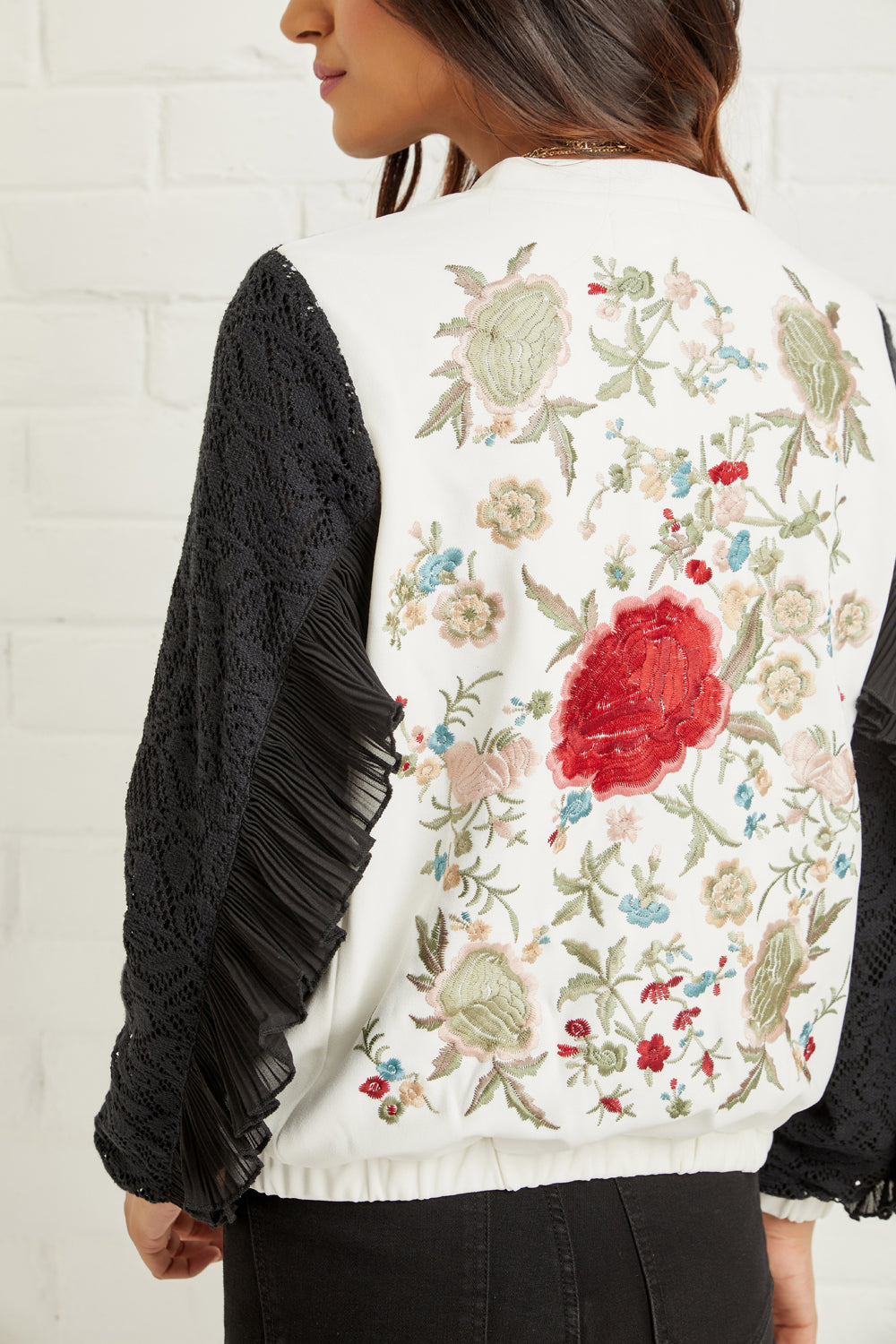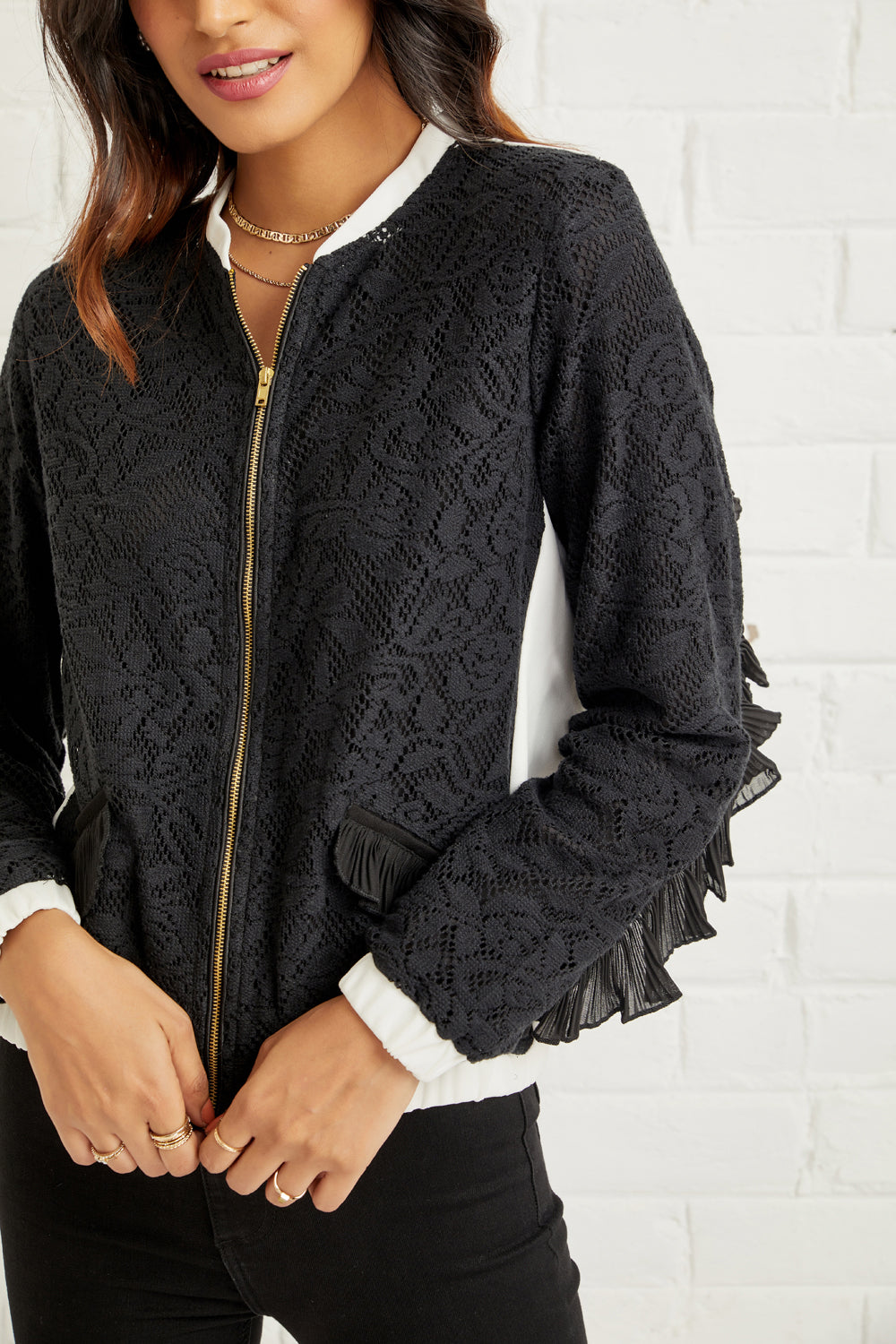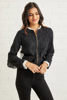 Beautifully crafted embroidered lace bomber jacket with pleated trim detail makes this an eye- catching and an elegant staple.