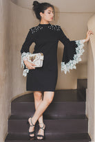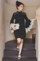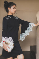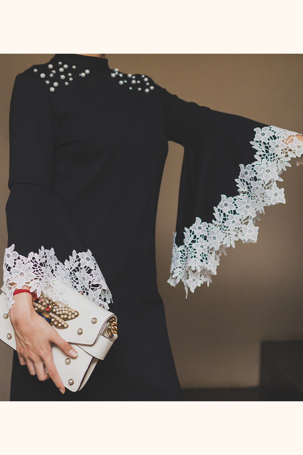 Floral Lace Detailed and Pearl Embellished Monochrome Dress