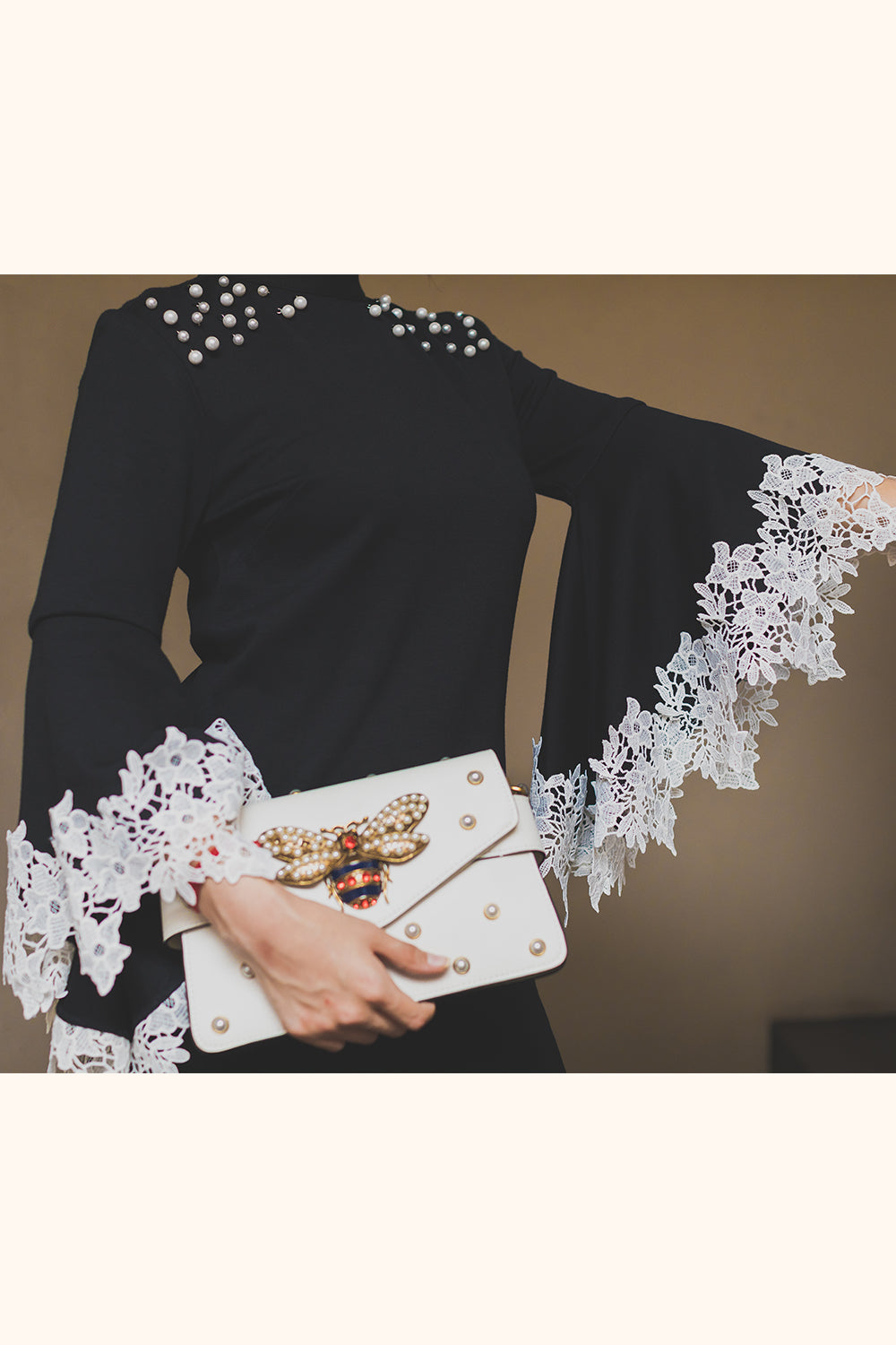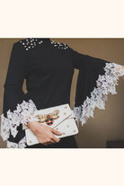 Featuring Flattering bell sleeves with exquisite floral lace and detailed pearls on the shoulders. An elegant staple.