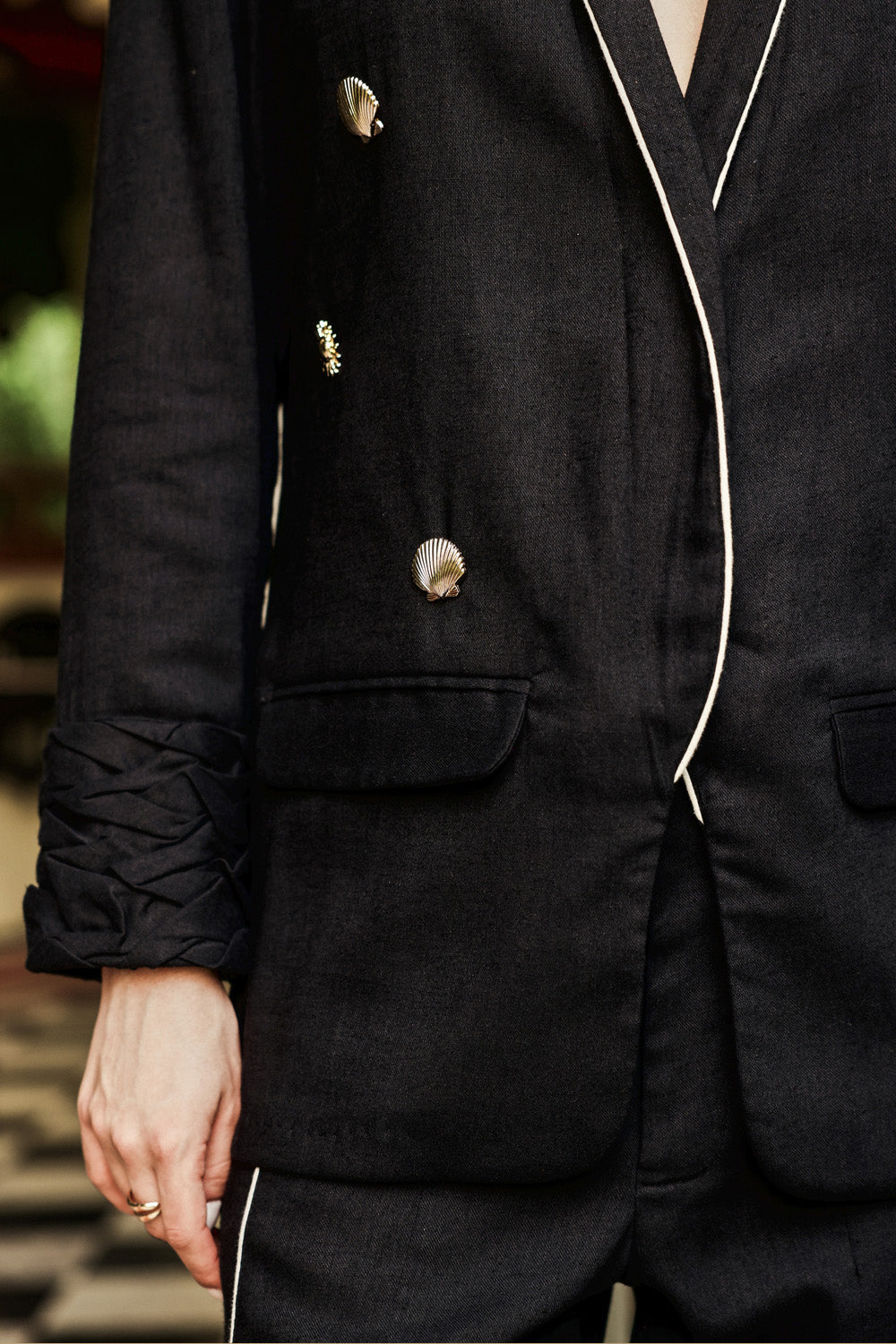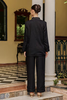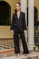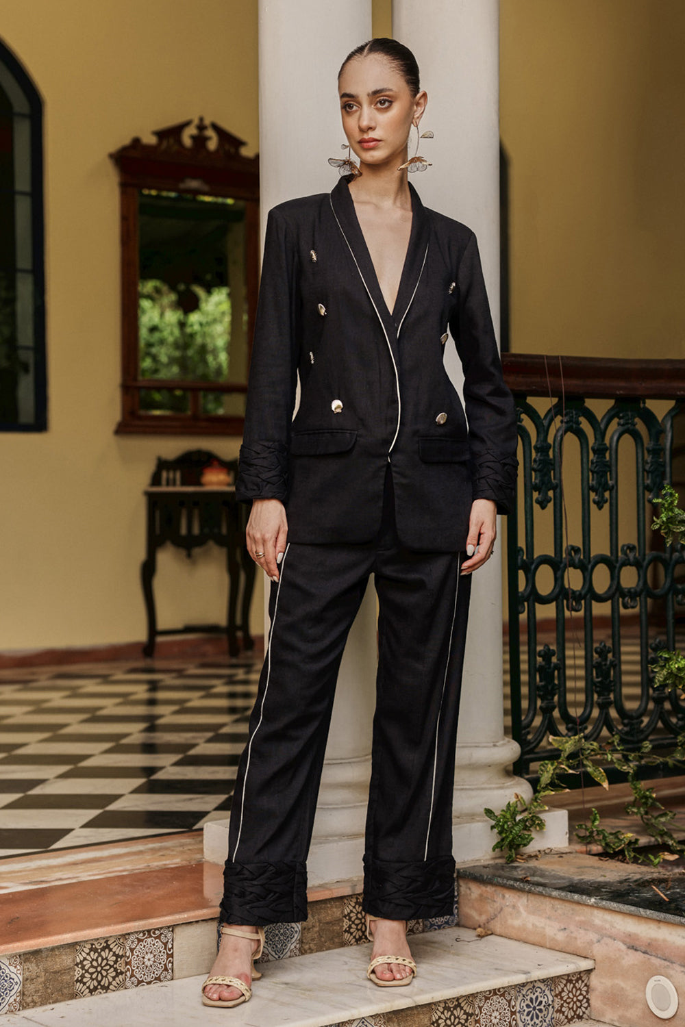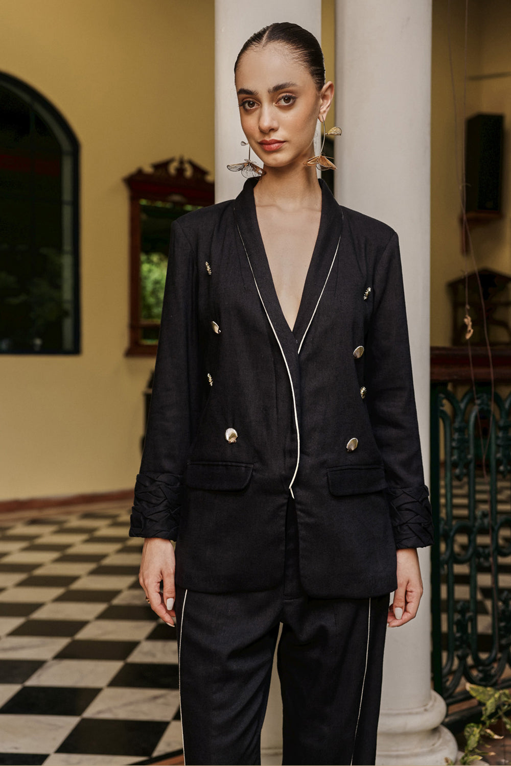 The classic Black blazer set set with beautiful shaped buttons and hand smoked hem, sleeved and pants.