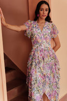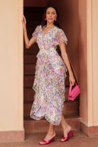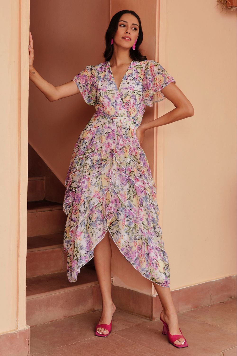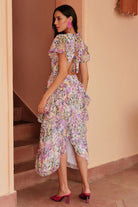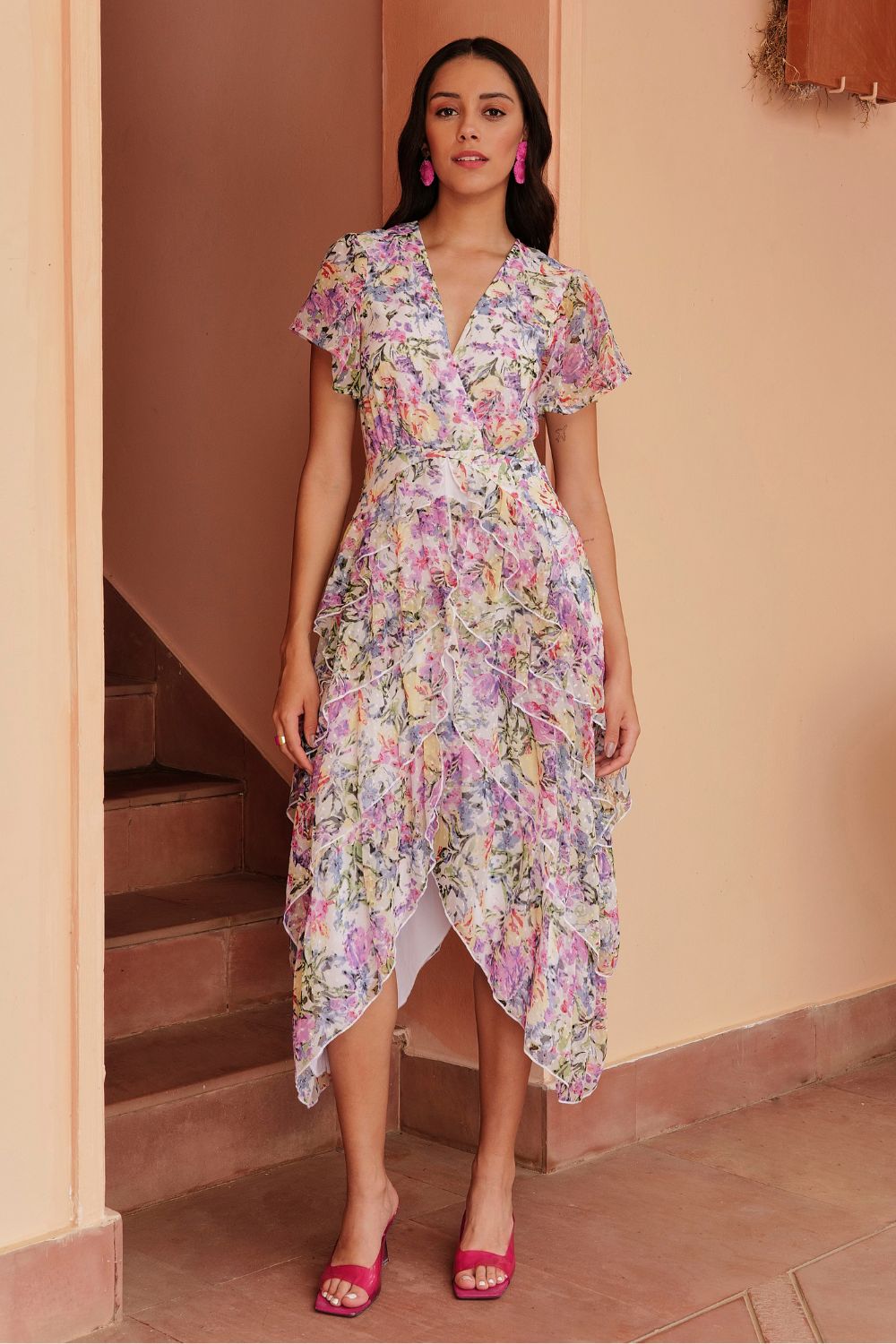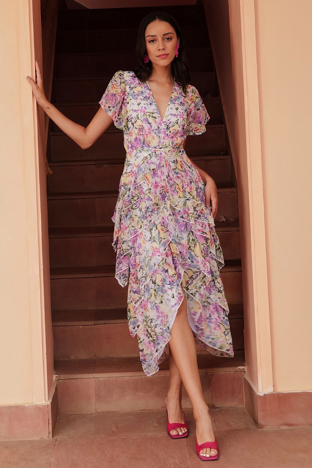 Your new yet fancy -yet -cool way to dress in happiness! The pastel hue delicate floral dress has every single detail to walk you through any season. It features a standout neckline and back ties in a flowy fit to follow your joyful loves around the city.