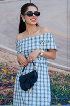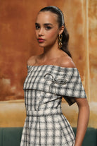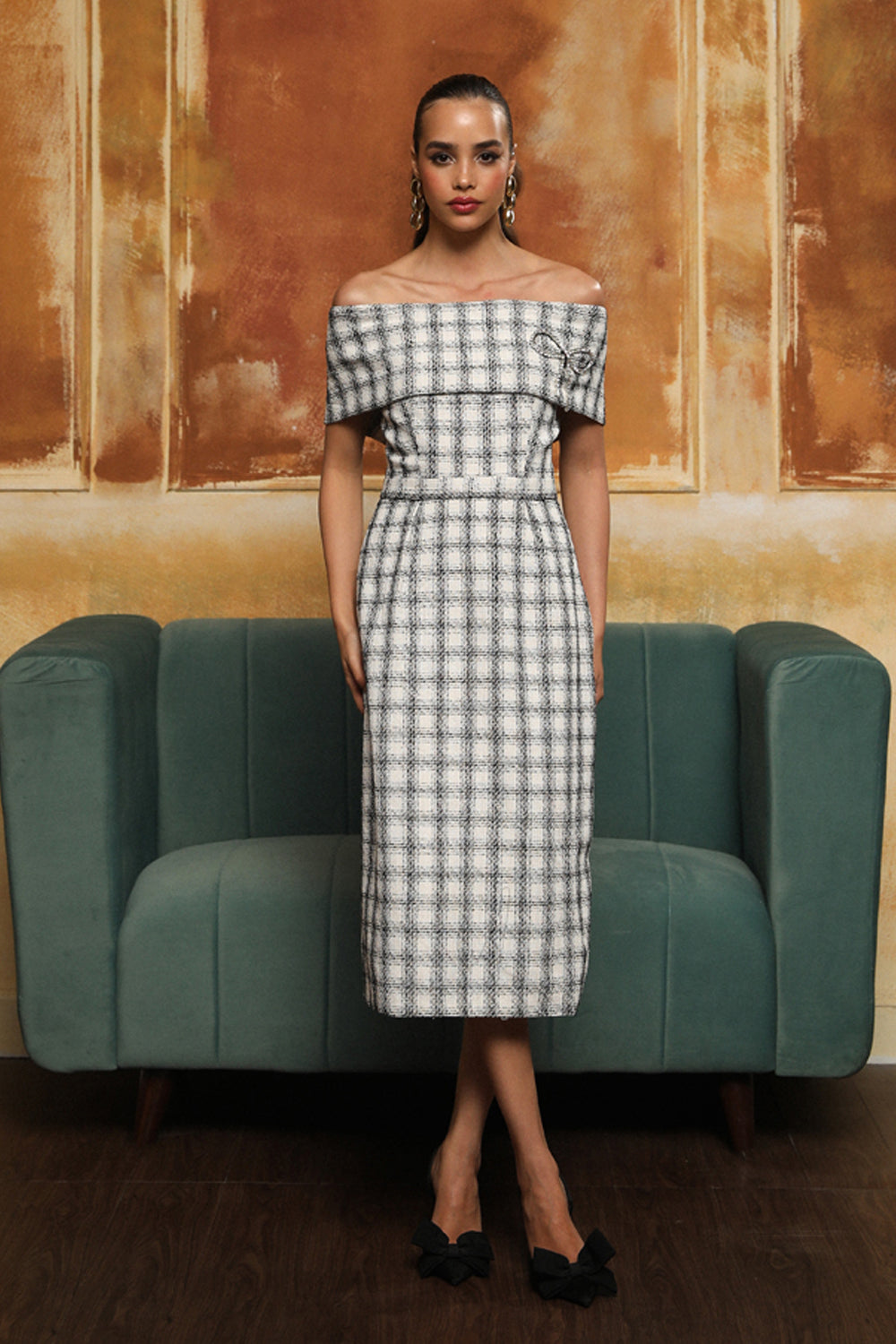 This off the shoulder midi tweed dress with a swaroski studded bow on the neckline is unique and perfect for a winter brunch or a sundowners.