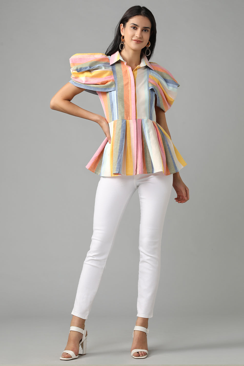 This shirt is structured yet delicate. Flattering sleeves and a peplum silhouette is a presentation of beauty and strength. A staple for your wardrobe.