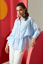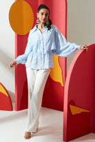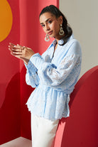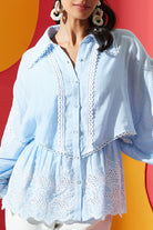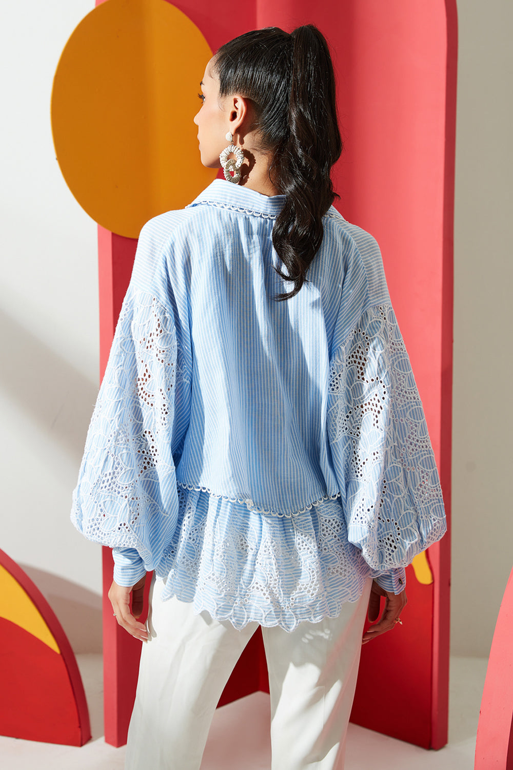 This stripped shirt has detailing of embroidery and cutwork and features and an over lay. It's crafted in cotton with a classic collar, detailed with a delicate lace trim. Balloon sleeves with cutwork embroidery makes this blouse a must have.