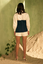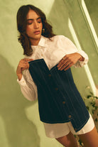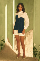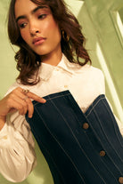 Crisp white shirt with overlay of denim button down and contrast stitching