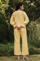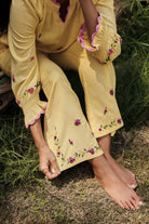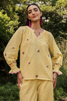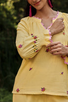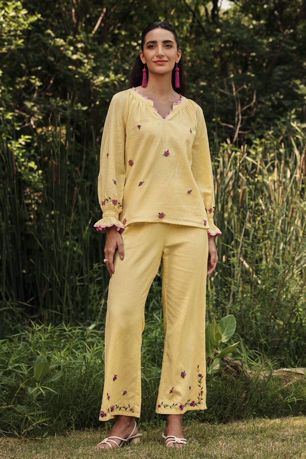 Hand embroidered french knot roses all over the blouse and bottom hem of the pants and detailed with contrast scallop lace. This matching set is perfect of a brunch.