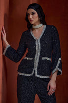 Glimmering sequinned tweed coord set with gold buttons and contrast tweed trims and gold buttons.