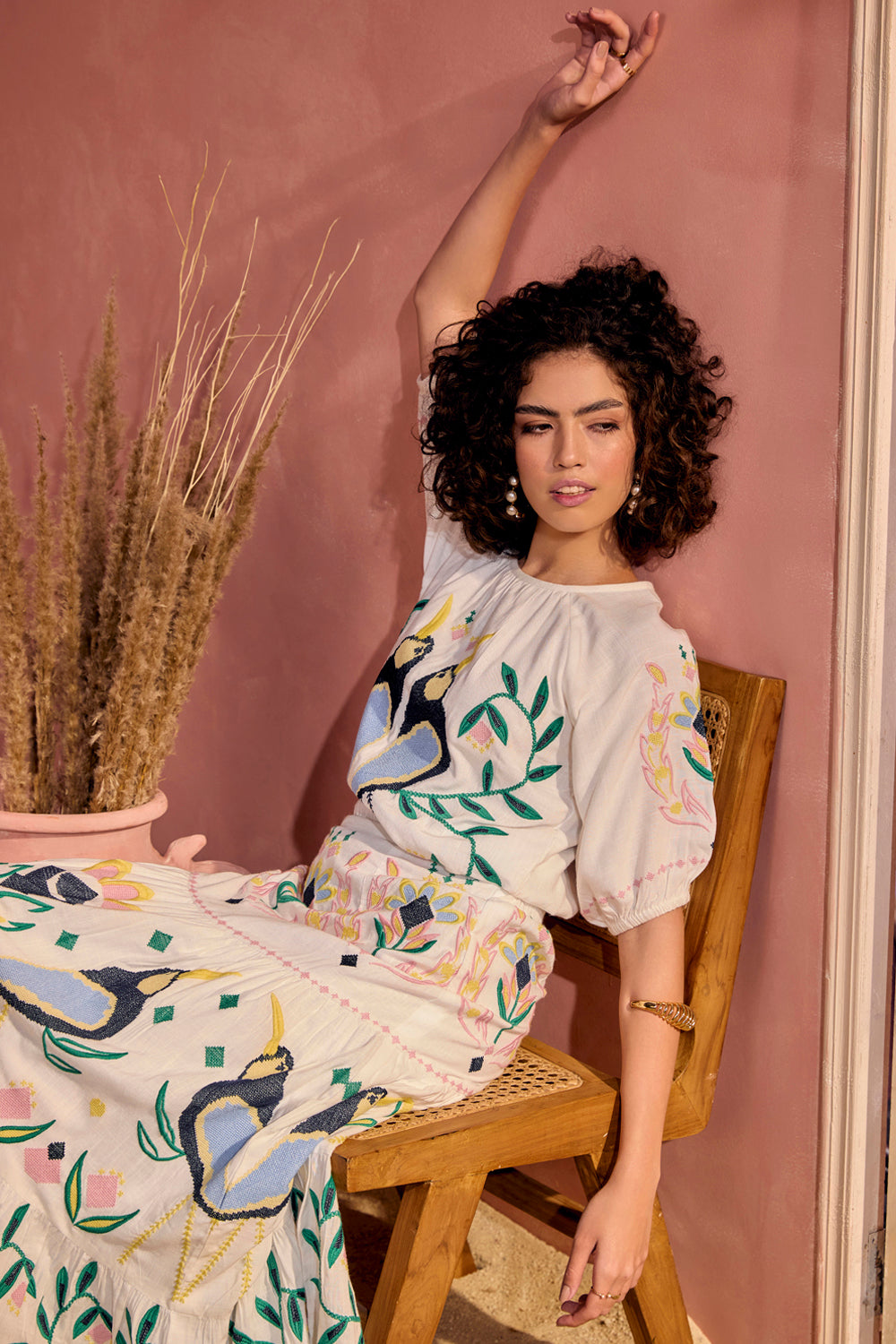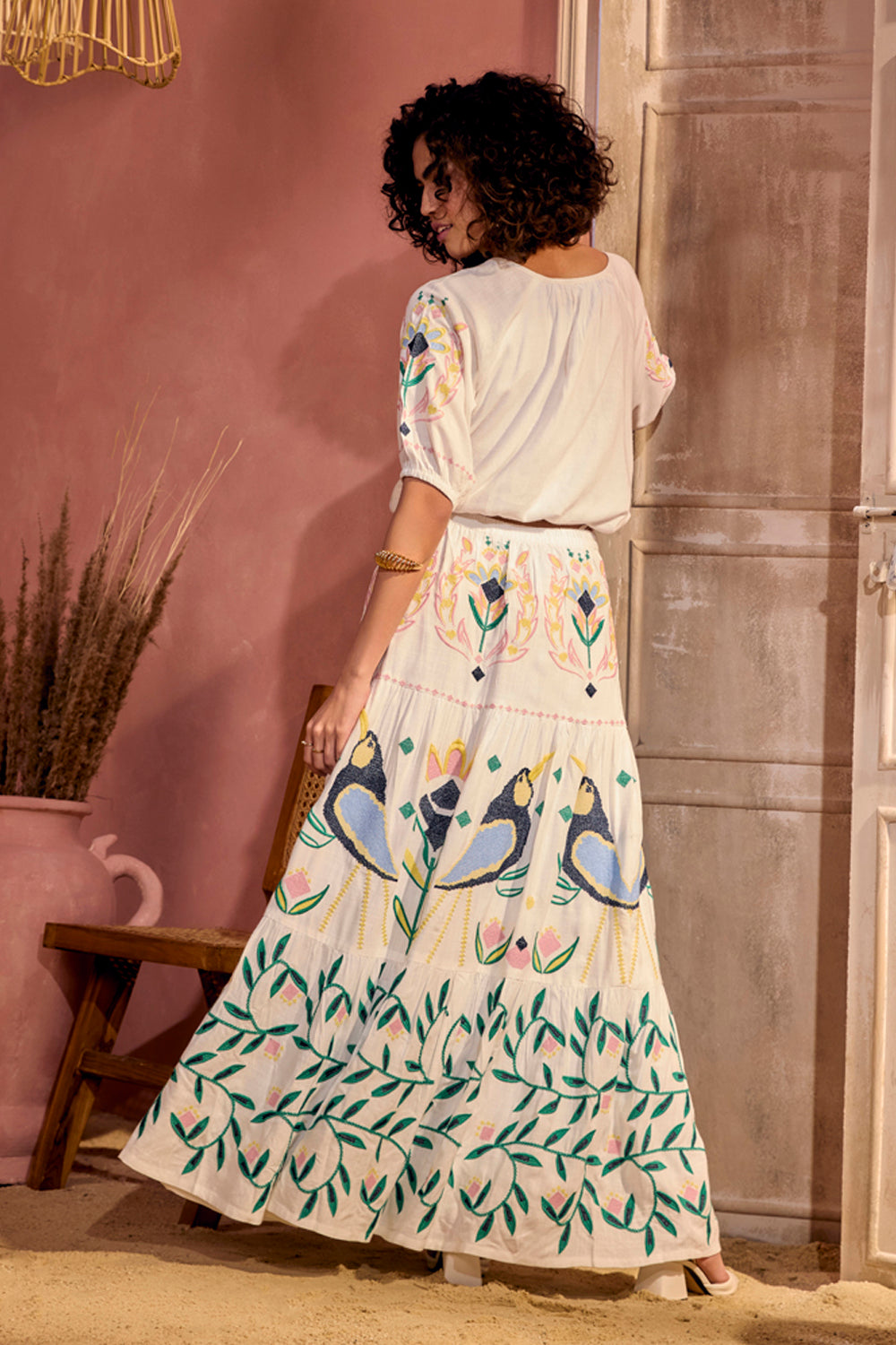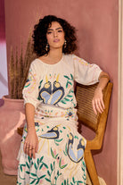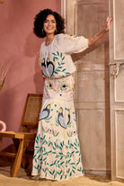 Feminine and a cheerful creation for a free spirited women. Fashion forward and vintage inspired embroidery makes this blouse and skirt set our absolute favourite.