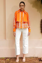 Beautifully crafted blouse in tangerine color with lace detailed trims and broderie on the sleeves and bottom hem.